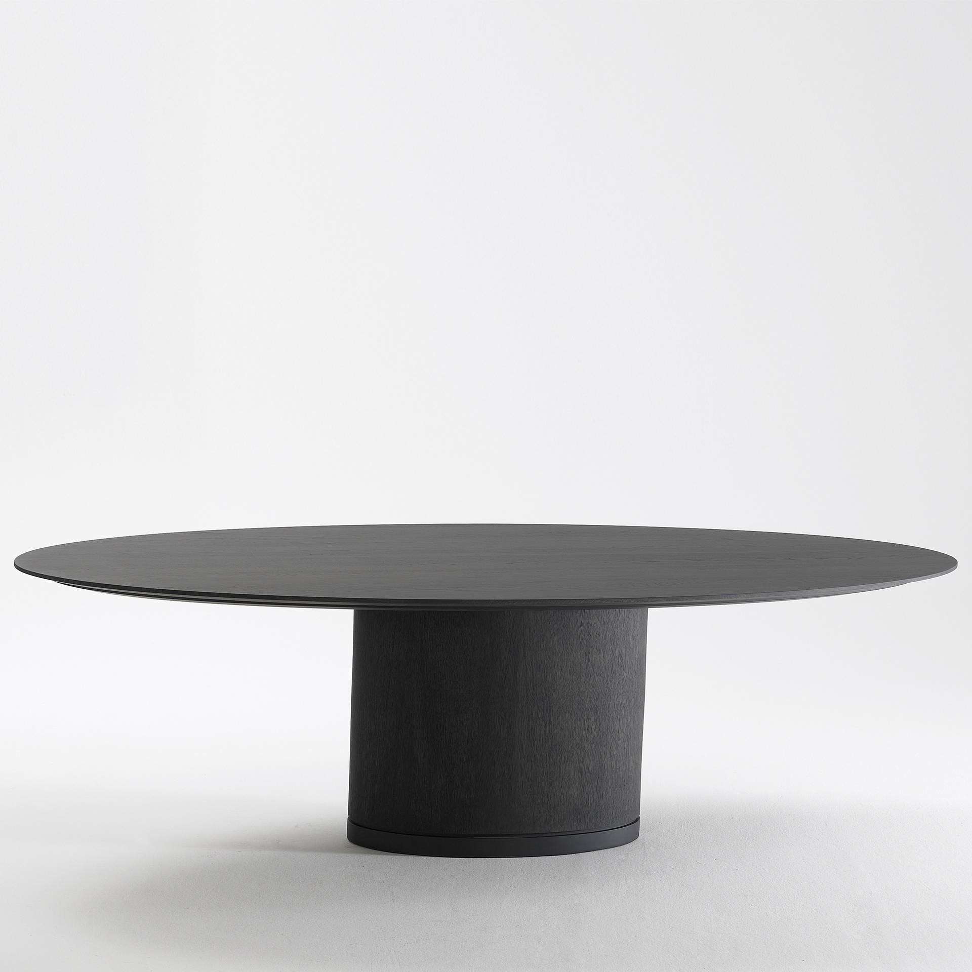 The ellipse top gives this robust column-table a characteristic elegance. The extension leaf of the extendable table is stored in the column and rises through a gas pressure system.