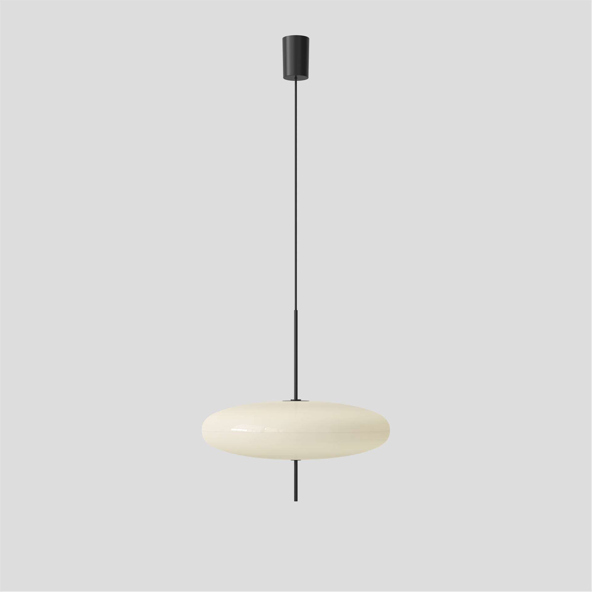 Model 2065 consists of a diffuser made up of two opalescent plates joined and suspended from the ceiling with a black painted aluminum rosette. A simple design played on the elliptical shape and the lightness of the materials which, together, seem to give life to a weightless creation. The lamp was relaunched by Astep in 2016 also in a second black version, in which the upper plate is finished with a soft-touch coating with a strong graphic expression. Five E14 LED bulbs provide illumination in all versions of the lamp.