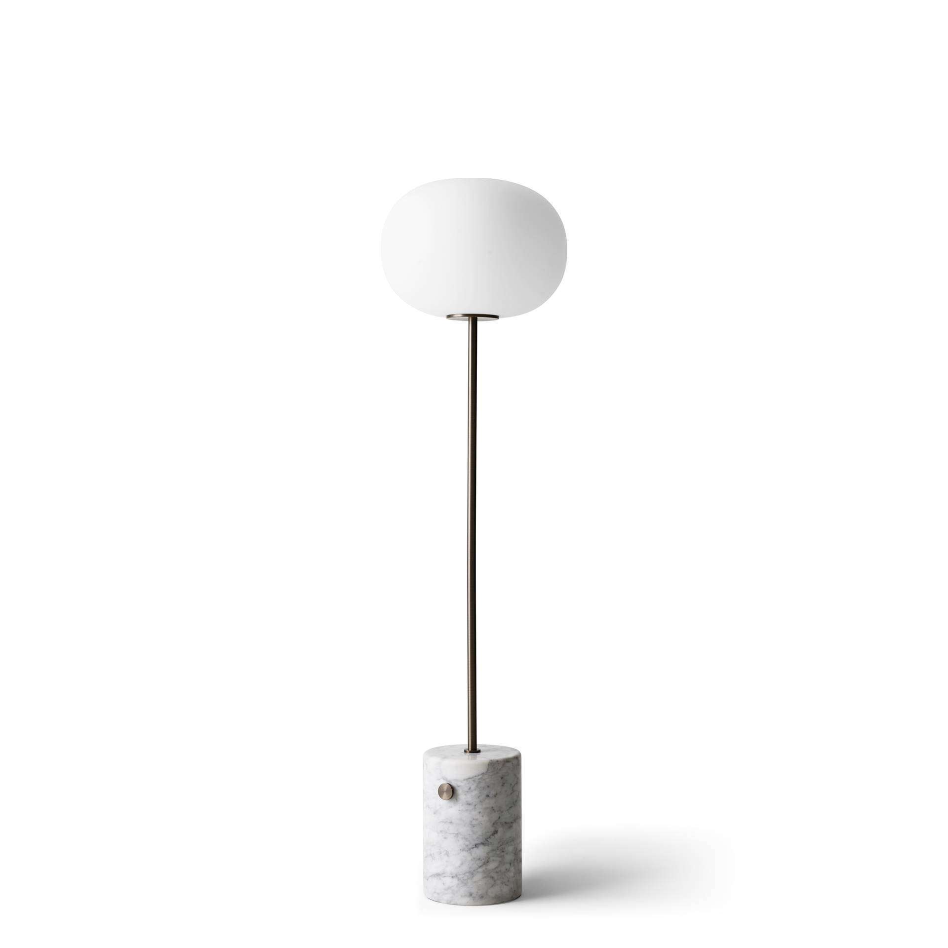 AUDO COPENHAGEN JWDA Floor Lamp Carrara Marble - Reworking the dimensions of the JWDA Table Lamp to create a pared-back light with a bold personality, the Floor Lamp is the latest addition to the series. The simple, standalone design merges contrasting elements to elegant effect: set on a stem of powder-coated steel or solid brass, the shade is formed from opal glass into an elliptical shape, while the base retains its characteristic form, crafted from marble with gently rounded edges and punctuated with a decorative dimmer switch in brushed or bronzed brass..