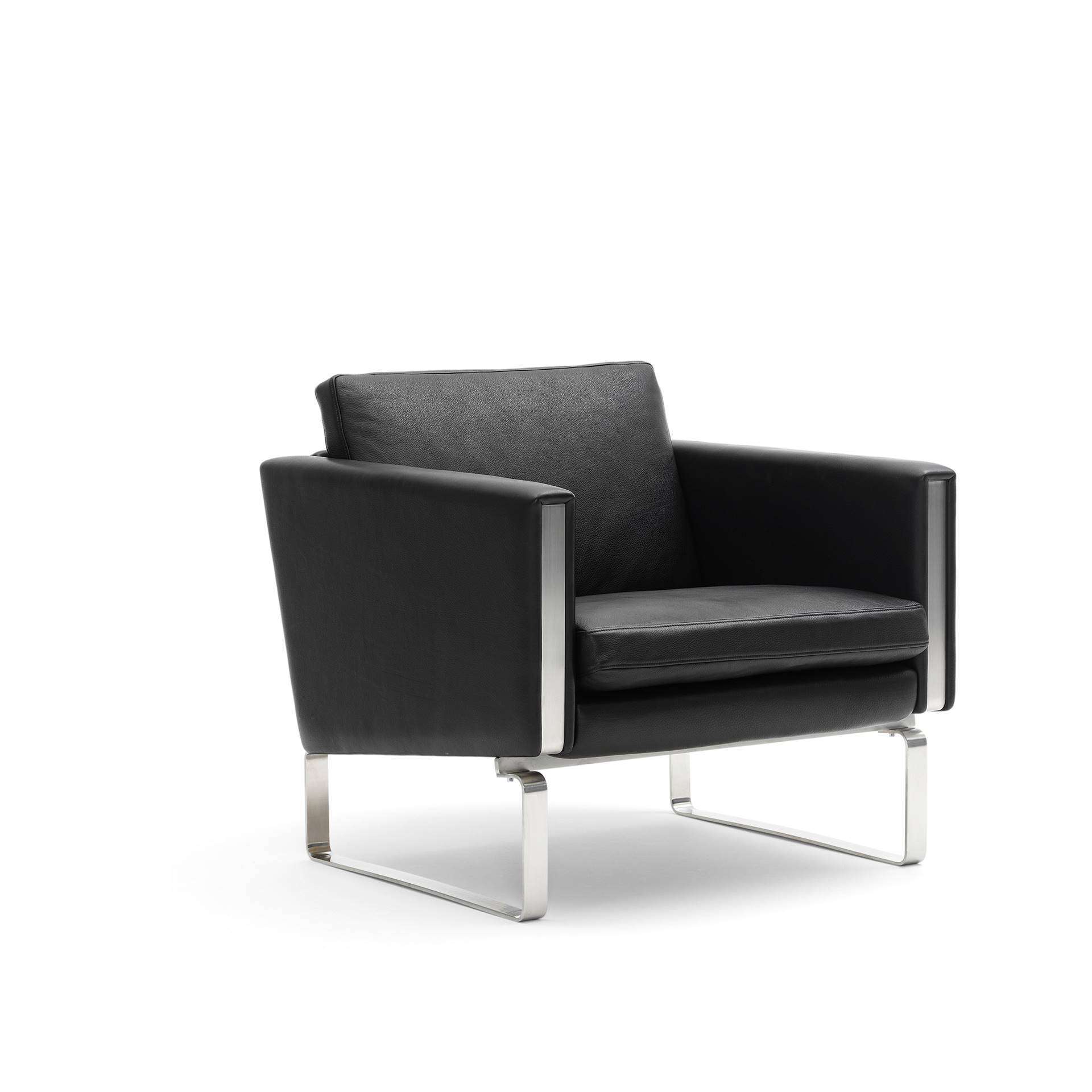 CARL HANSEN CH101 Lounge Armchair - The CH101 Lounge Chair by Hans J. Wegner is a modern lounge chair ideal for contemporary interiors. It combines brushed steel and traditional leather upholstery in an appealing design, and comfort is ensured with cushions that combine foam and soft down. The CH101 lounge chair is part of a series of geometric furniture created by Wegner in 1970 to suit a variety of different spaces.