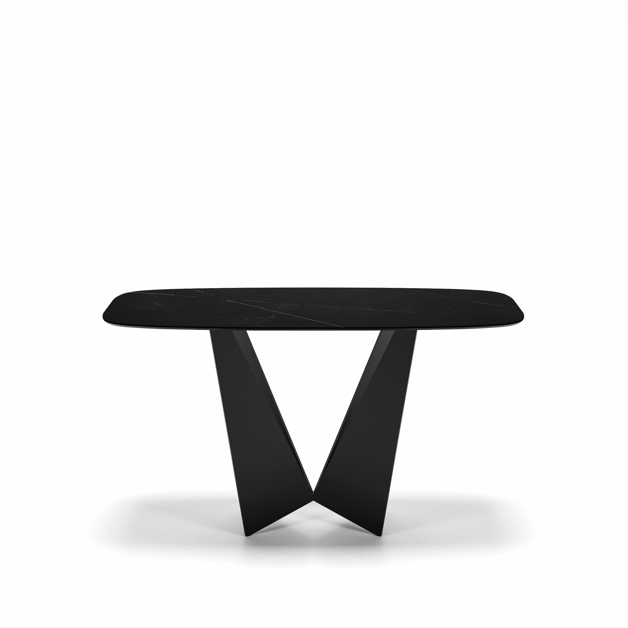 A console with an important metal frame: on its own it furnishes a space, elegant and slender. Eiffel has an oval top in wood, stoneware or lacquered glass.