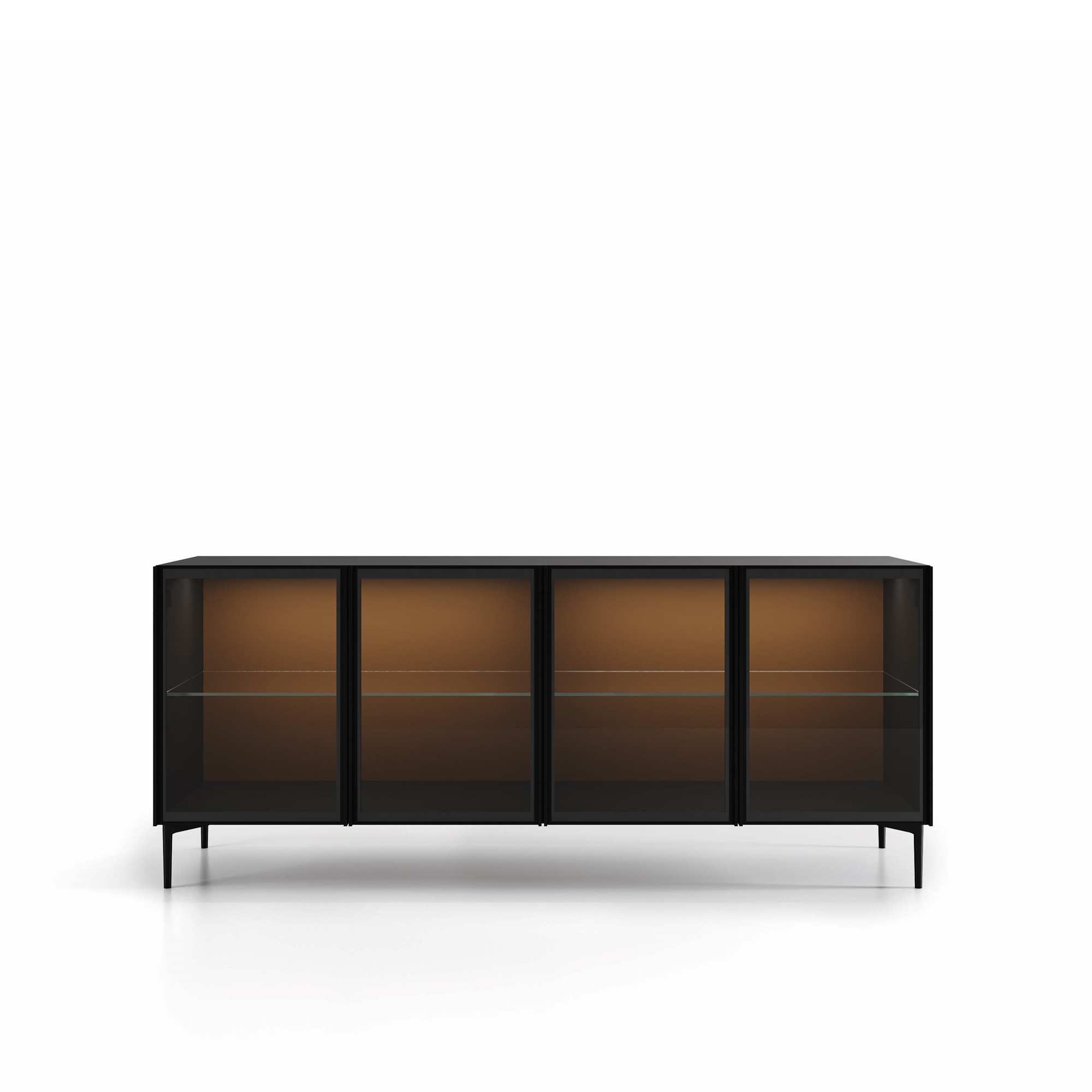 Depending on your needs you can choose Glass Up sideboard with two, three or four glass doors with a plain transparent finish, or still transparent but with gray or bronze coloring. The shelves are made of glass or, upon request, of wood and can be accessorized with a bottle holder element, drawers and LED lights, as well as with the inner lining of the back in regenerated hard leather.