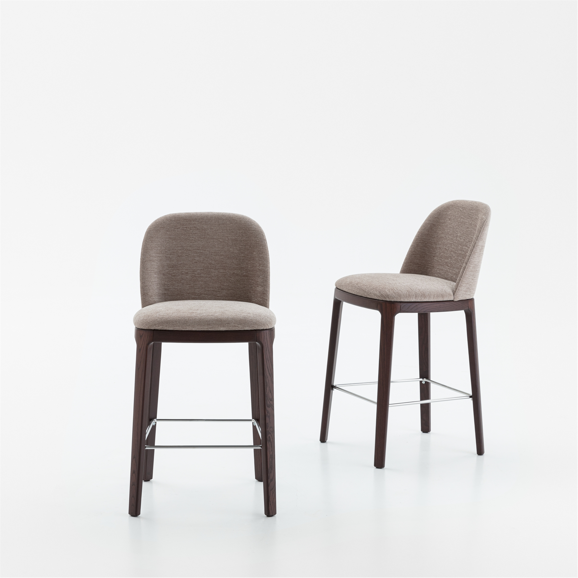 The Joelle stool, with its wooden frame and upholstered backrest, is part of a family of cosy and comfortable seats designed to adapt gracefully to a variety of environments, from the kitchen island to the bar area of a club. A stool that embodies the essence of form, elegance of design and meticulous attention to detail.