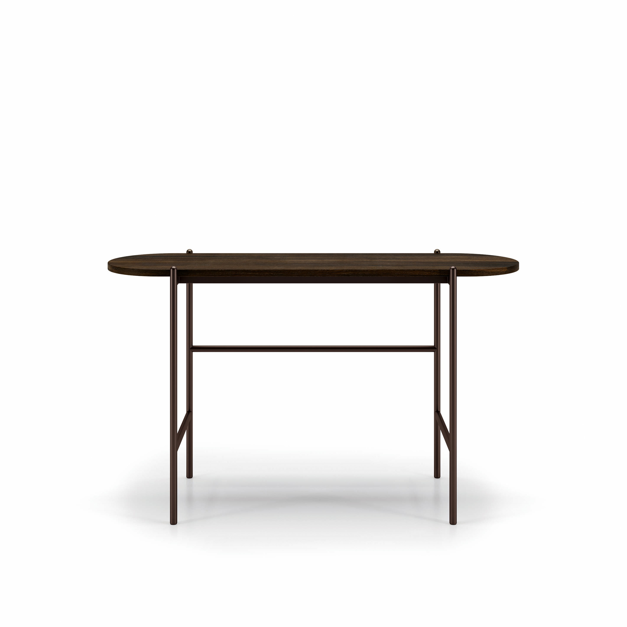 The Supernova oval console is essential and linear in its painted metal rod support, yet soft. And the top ranges between wood, wood essence or lacquer finishes, including special ones, or even stoneware.