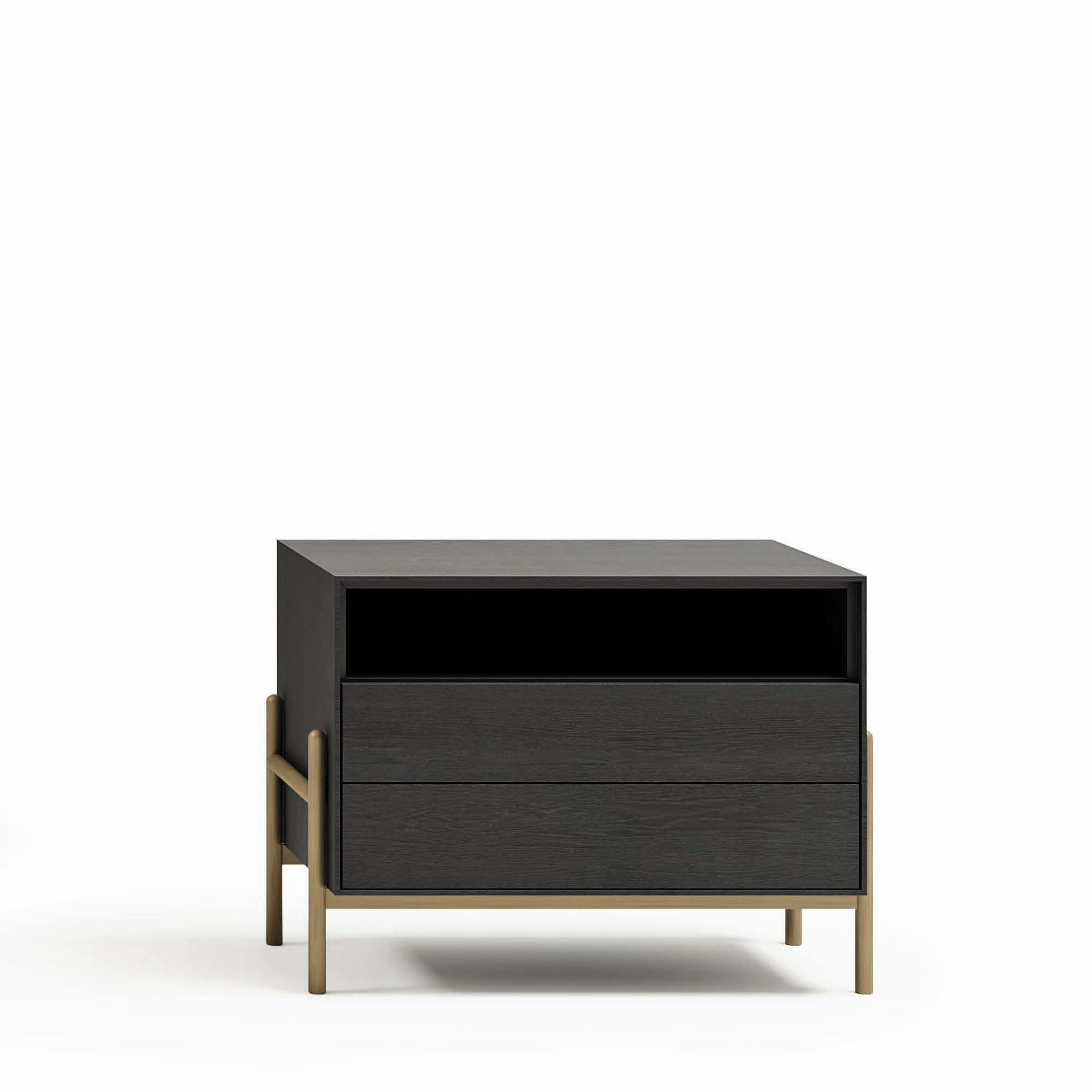 The Supernova night storage units combine their unmistakable painted rod base with drawers in linear shapes, with elegant and simple 45° joints. The storage elements are embraced by the metal frame, which rises sideways along the sides.