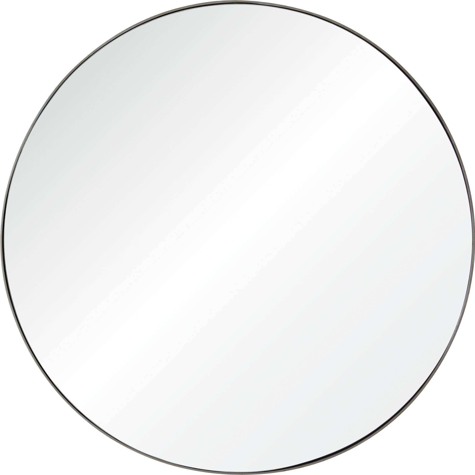 The circular curves of this modern wall mirror are simple and chic. A low-profile metal frame mimics the inner arc of the beveled looking glass. Finished in raw iron for a subtle metallic shimmer, the spherical shape suits classic and contemporary spaces alike.