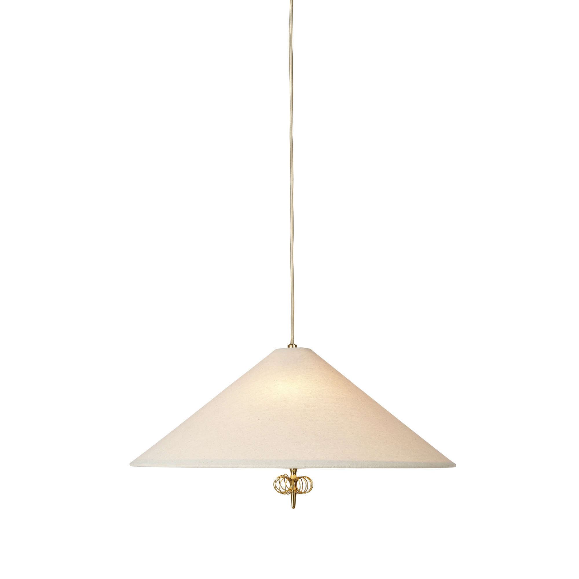 Known to many as ‘the man who illuminated Finland’, the legendary designer and metal smith Paavo Tynell is one of the leading lights of 20th-century industrial design . A classic 1950s Tynell design, the 1967 pendant expands on the design language developed in 1948 for the 1965 pendant. The 1967 is characterized by a conical canvas shade which exudes warm ambient light, with Tynell's signature brass hardware adding a subtle, premium expression. Below the bulb, a fabric diffuser modulates the light and, beneath this, a decorative brass detail gives each lamp a flourish of character, and subtly influences the play of light it generates.