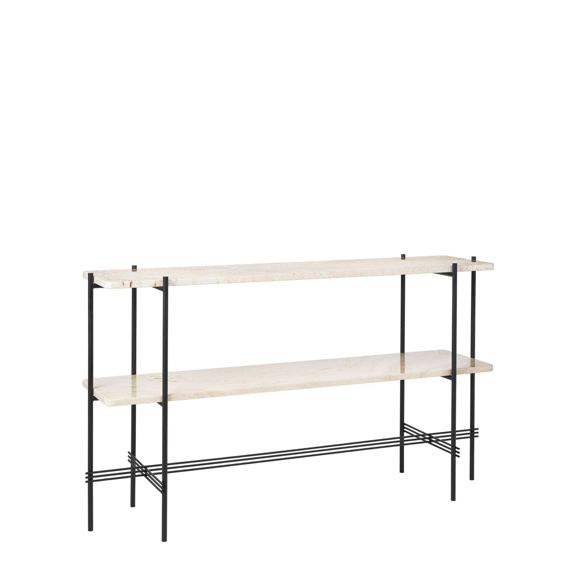 GUBI TS Console 120 - 2 Racks - Black base, Oyster White Glass - Floor Model- The TS Console creates a sophisticated and sculptural aesthetics for any room with its characteristic slender legs, beautifully crossing details and contrasting solid table top.