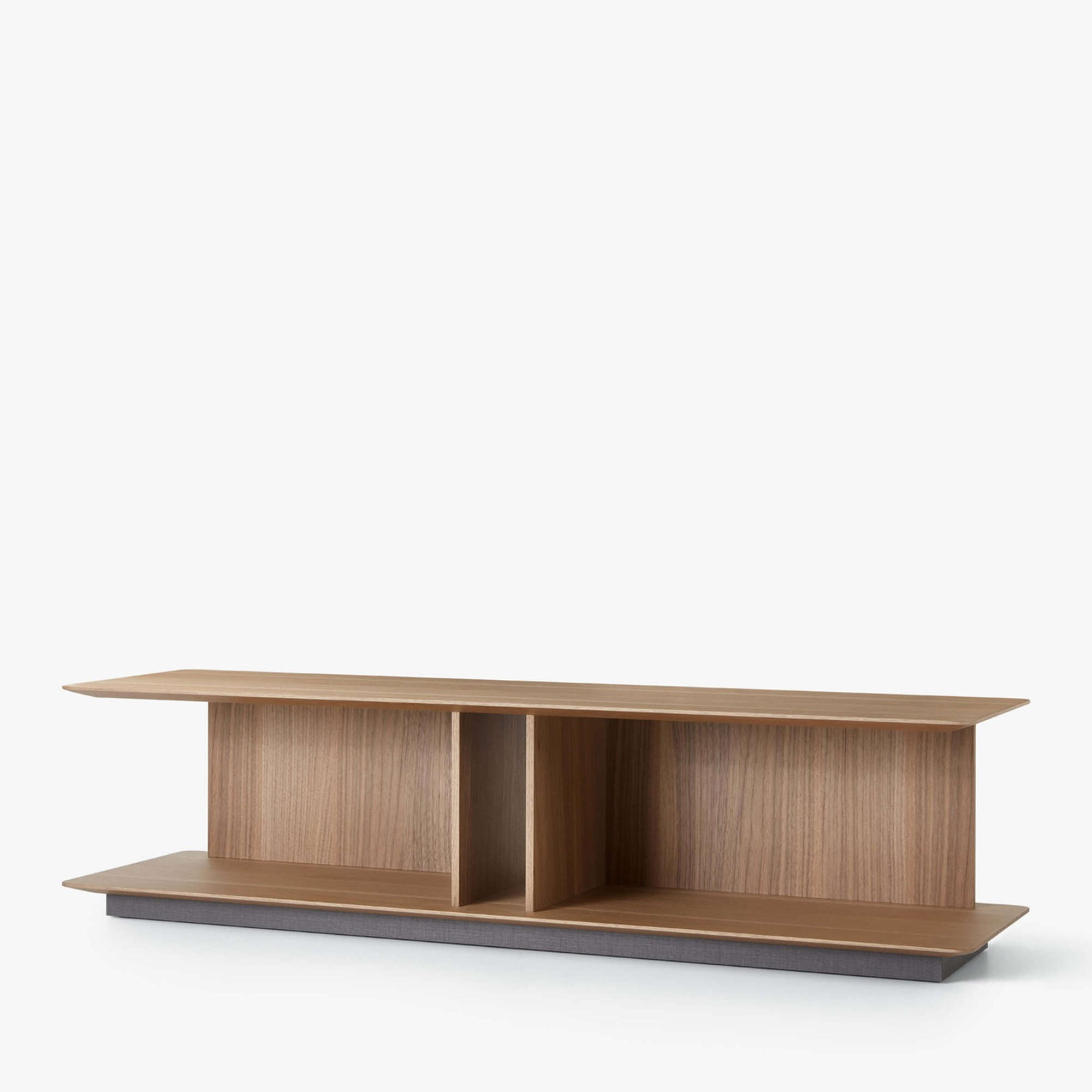 The elegant and well-proportioned Venise coffee table was designed to complement the sofa from which it takes its name, in line with its horizontal geometry. Configurable as a central or end element with a double top with side bookcase shelves and storage compartments, to hold living room objects.