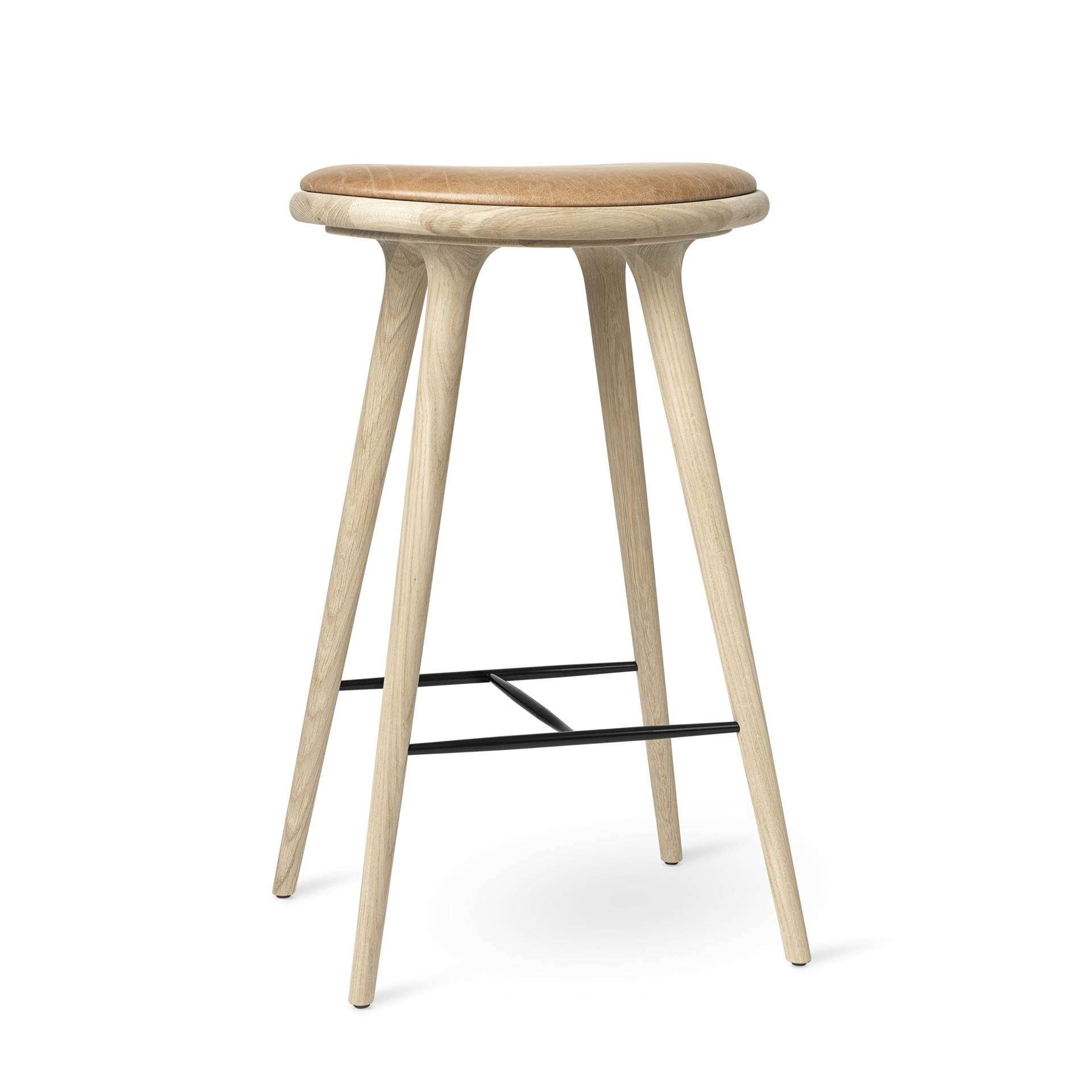 MATER High Stool 29" Soaped Oak Tanned Leather Seat - Mater’s High Stool, described as a new Danish classic, was designed by Danish design studio Space Copenhagen. The elegant, organic design is well suited for kitchen counters in both domestic and commercial settings. High Stool is made of solid, FSC certified oak with a soaped finish, and it features a seat upholstered with genuine leather.