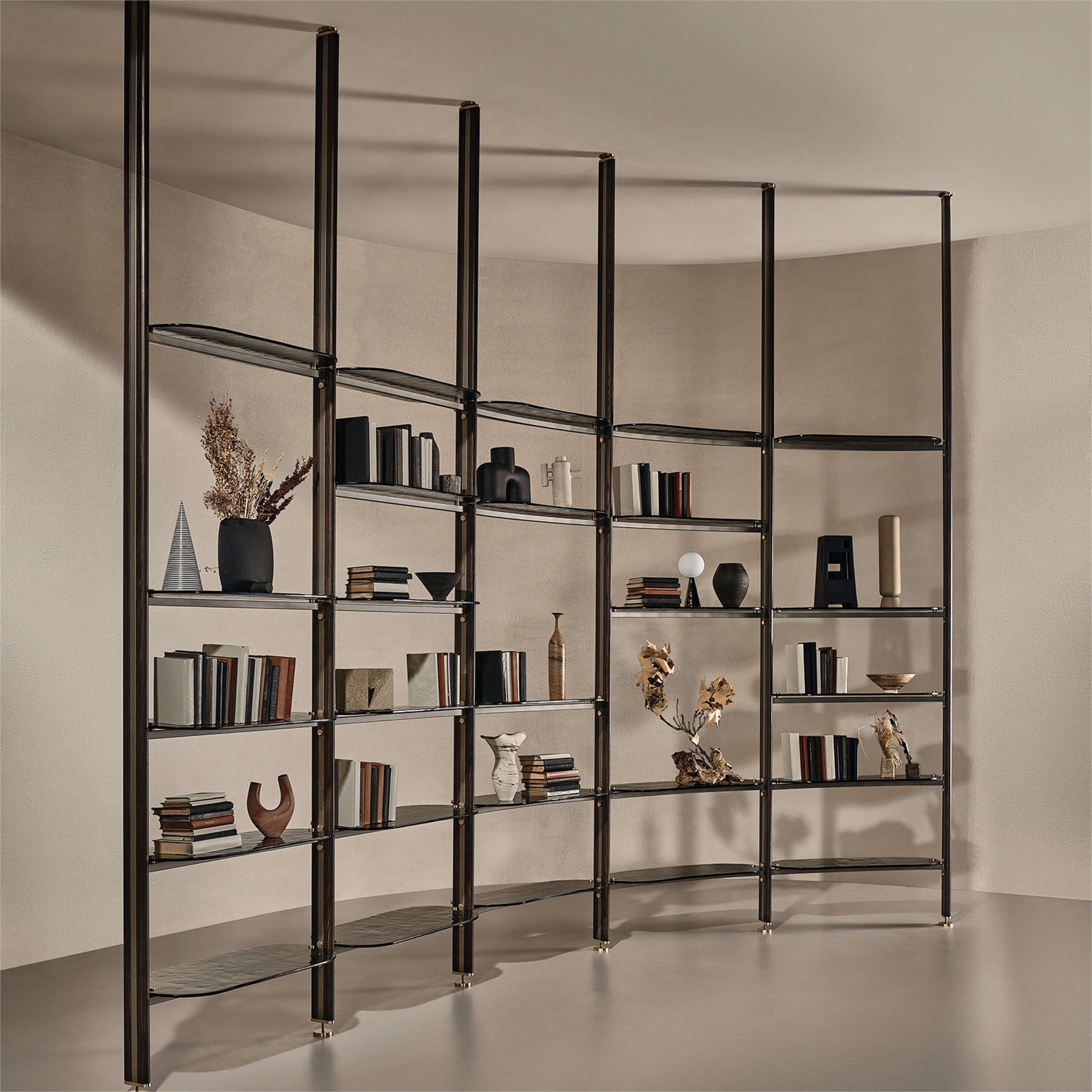 The Stem bookcase uses versatile, aesthetic, functional elements that expand its compositional range, with wooden uprights that create spaces to experience in absolute freedom. It can be used against a wall or in the middle of the room in its linear or rounded version, lightly defining environments with elegance and sophistication. Glass or wooden shelves and wooden containers enhance the compositions, leading to additional storage solutions and giving the bookcase greater functionality.