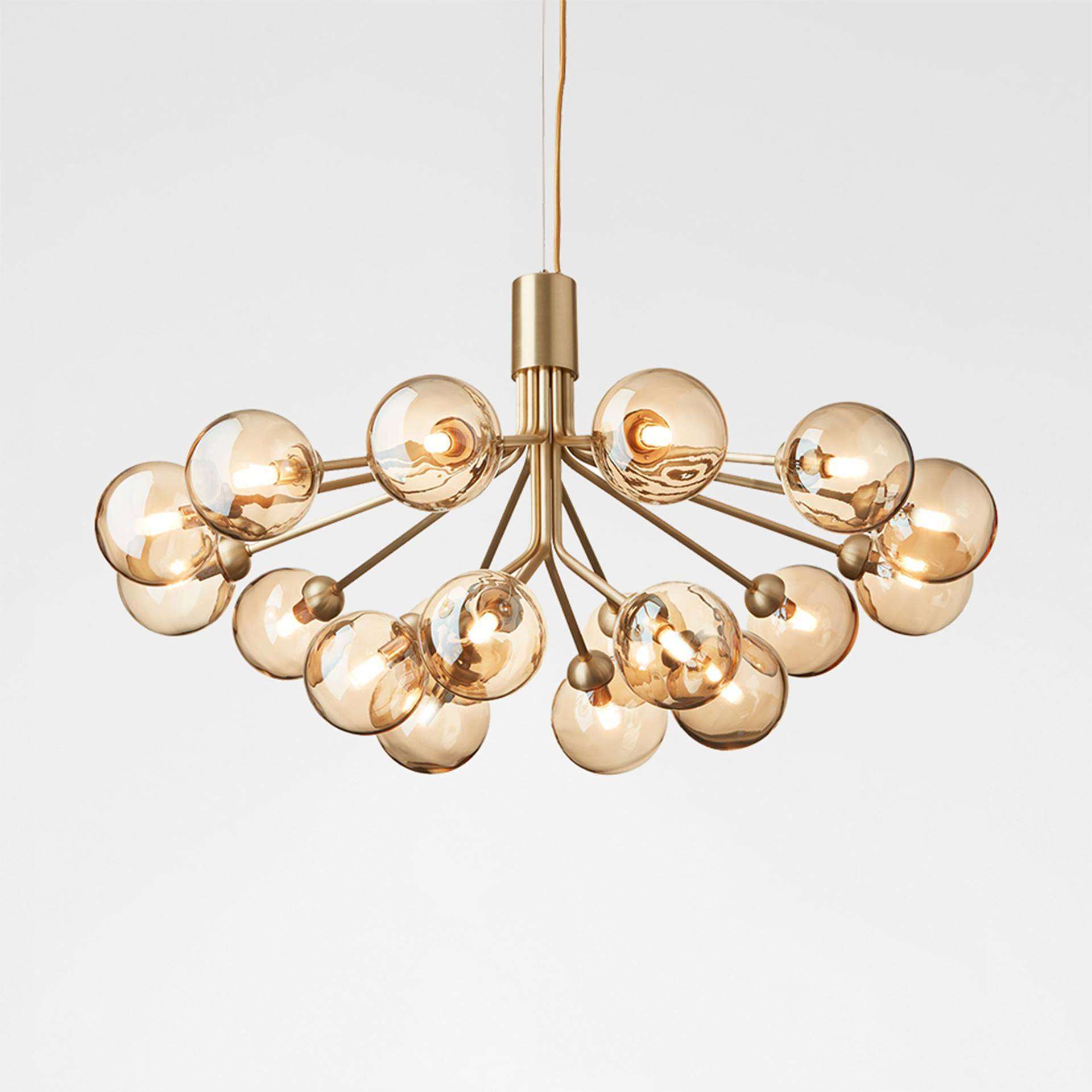 The collection consists of chandeliers with 18 mouth-blown opal white glass globes and has a golden brushed brass finish.
