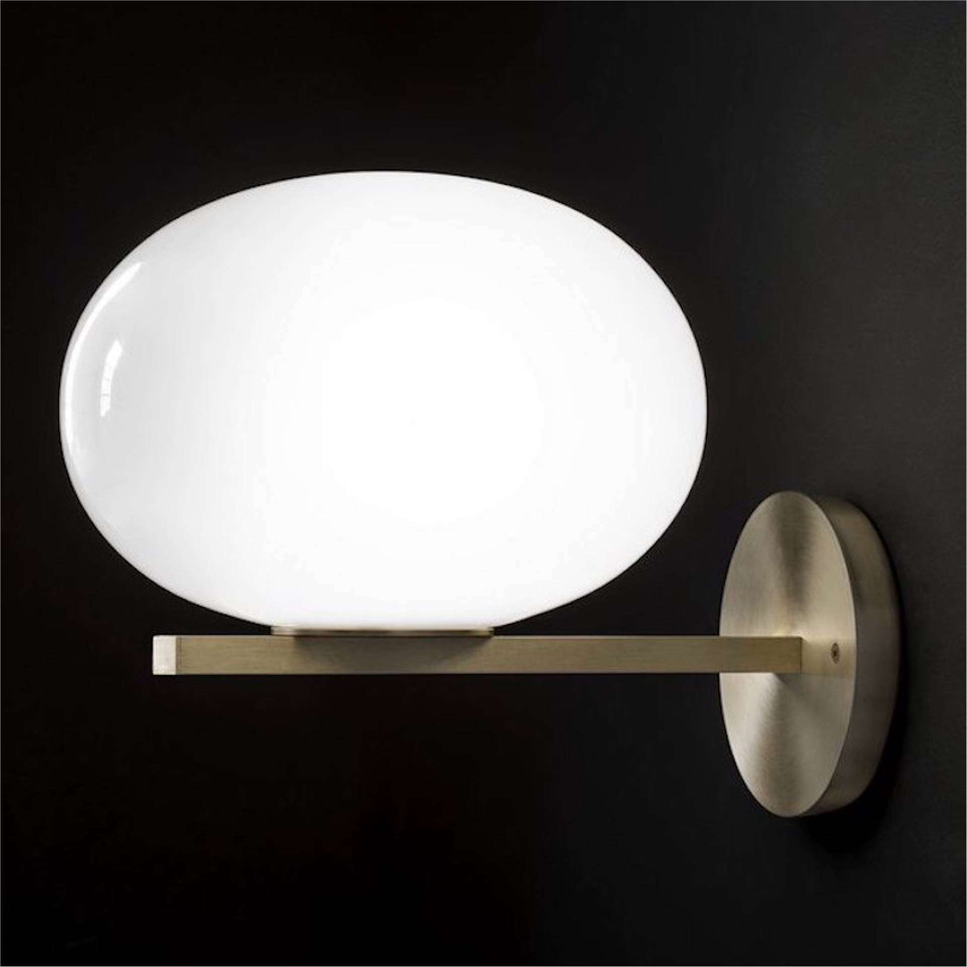 OLUCE Alba Wall Light One Arm - The concept of Alba starts with a very simple element: the designer’s imagination was inspired by a drop of water – which she puts to use in different ways, depending on the model. References to the world of nature, with soft shapes contrasted with square lines, together with the use of a satin brass finish, combine to create Alba, a wall lamp with a strong visual impact.