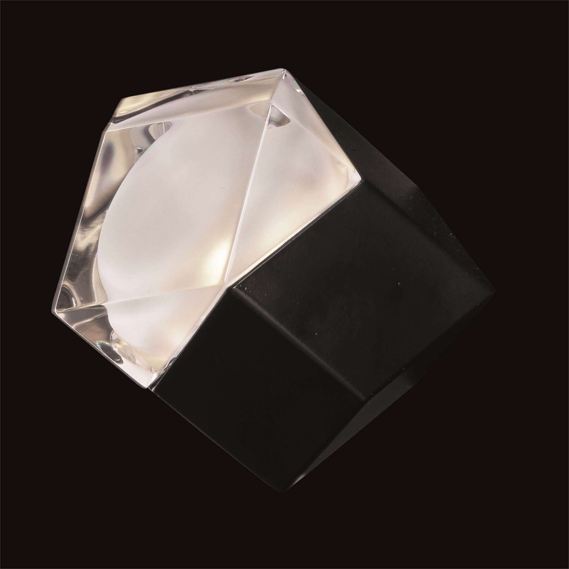 OLUCE Astro Wall Lamp - The Astro has three transparent and sanded surfaces and the rest are opaque, making it look like a little jewel whose geometrics are underlined by the materials that form it: the metal part, which comes in white or black, and the transparent and sanded glass create a “prism” effect on the light.