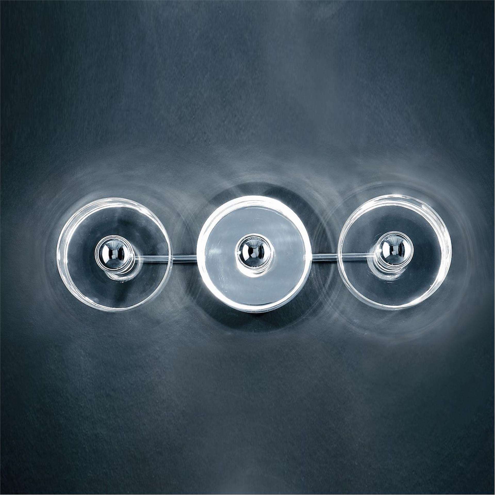OLUCE Fiore Wall - In designing this family of lamps, Marta Laudani and Marco Romanelli recover natural elements and 1970-style recollections making them the focal point of the project: the lamp becomes the archetype of a flower, with a central core and radiating petals. The single element, a transparent blown glass cylinder that contains the source of light, is joined to a metal body to form several combinations, creating, in fact, a stylised flower. In the wall/ceiling version, Fiore is available with 7 luminaires, 3 luminaires – in the linear and triangular variations – and with only one luminaire, creating geometric or decorative motifs on the domestic surfaces. Instead, in the suspension version of the lamp, Fiore twirls free, with a combination of either 13 or 7 luminaires – according to the variation chosen.