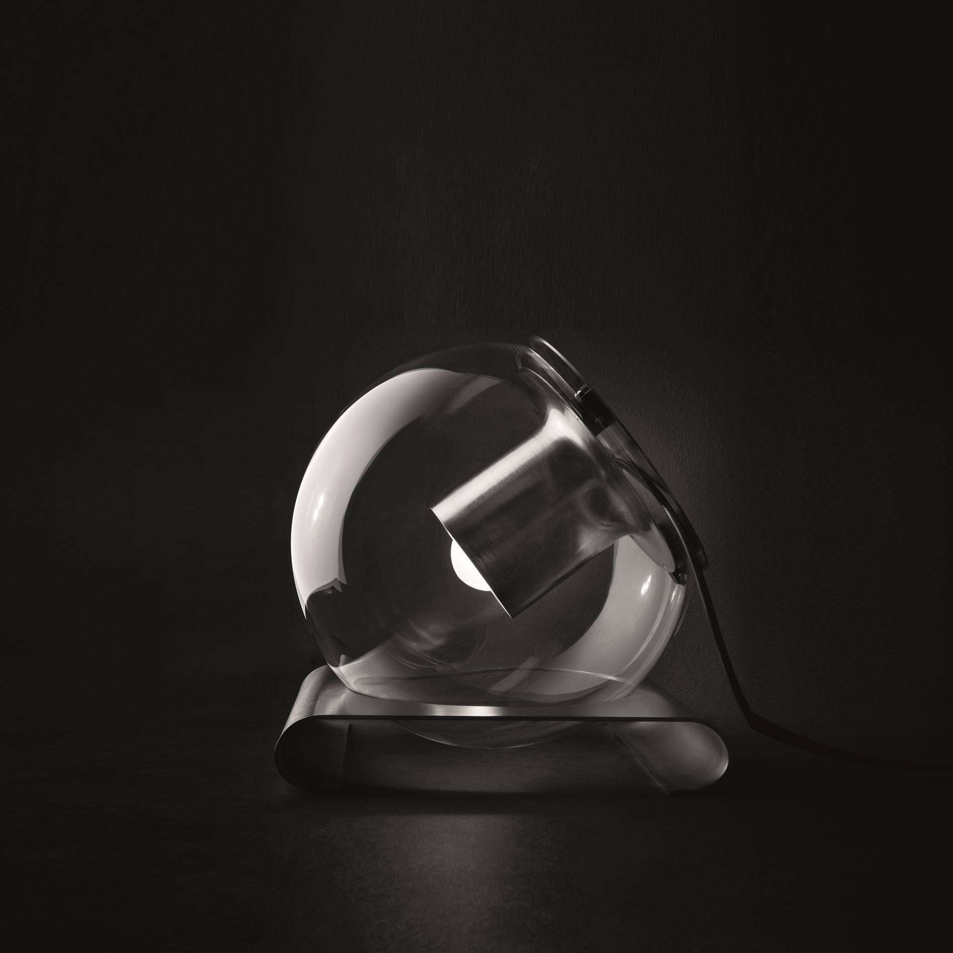 OLUCE The Globe Table Lamp - The Globe is a lamp which was designed by Joe Colombo in 1964, created in table, suspension and wall lamp versions, available in two sizes. Its pure geometries co-exist in a constant balance between shape and functionality: the transparent blown-glass sphere contains the cylindrical metal reflector that projects its timeless light into space.