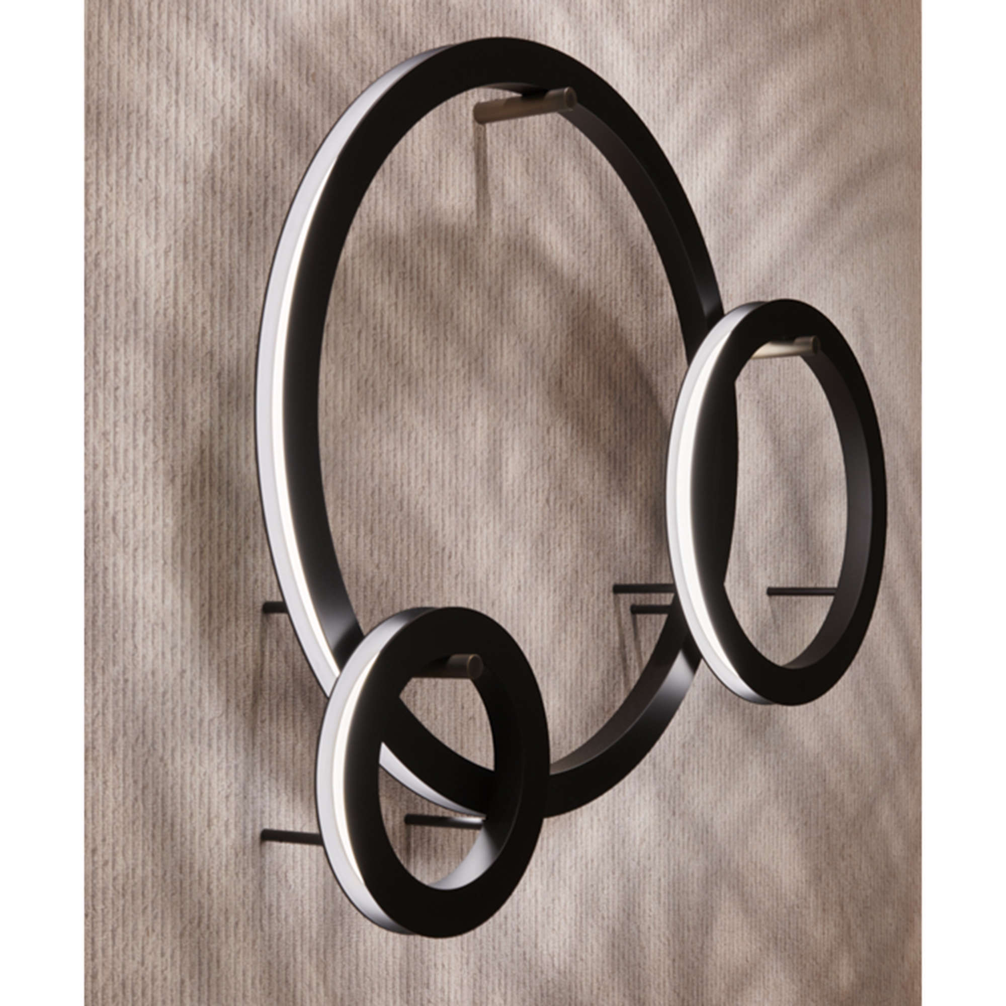 Three rings of different diameters that can be installed on the wall individually or in random composition. The metal ring has a matt black finish with a white opal polycarbonate LED light diffuser around the perimeter. Each ring is fixed to the wall by a metal cylinder in matt brass bronze finish and by two metal spacers in matt black finish.