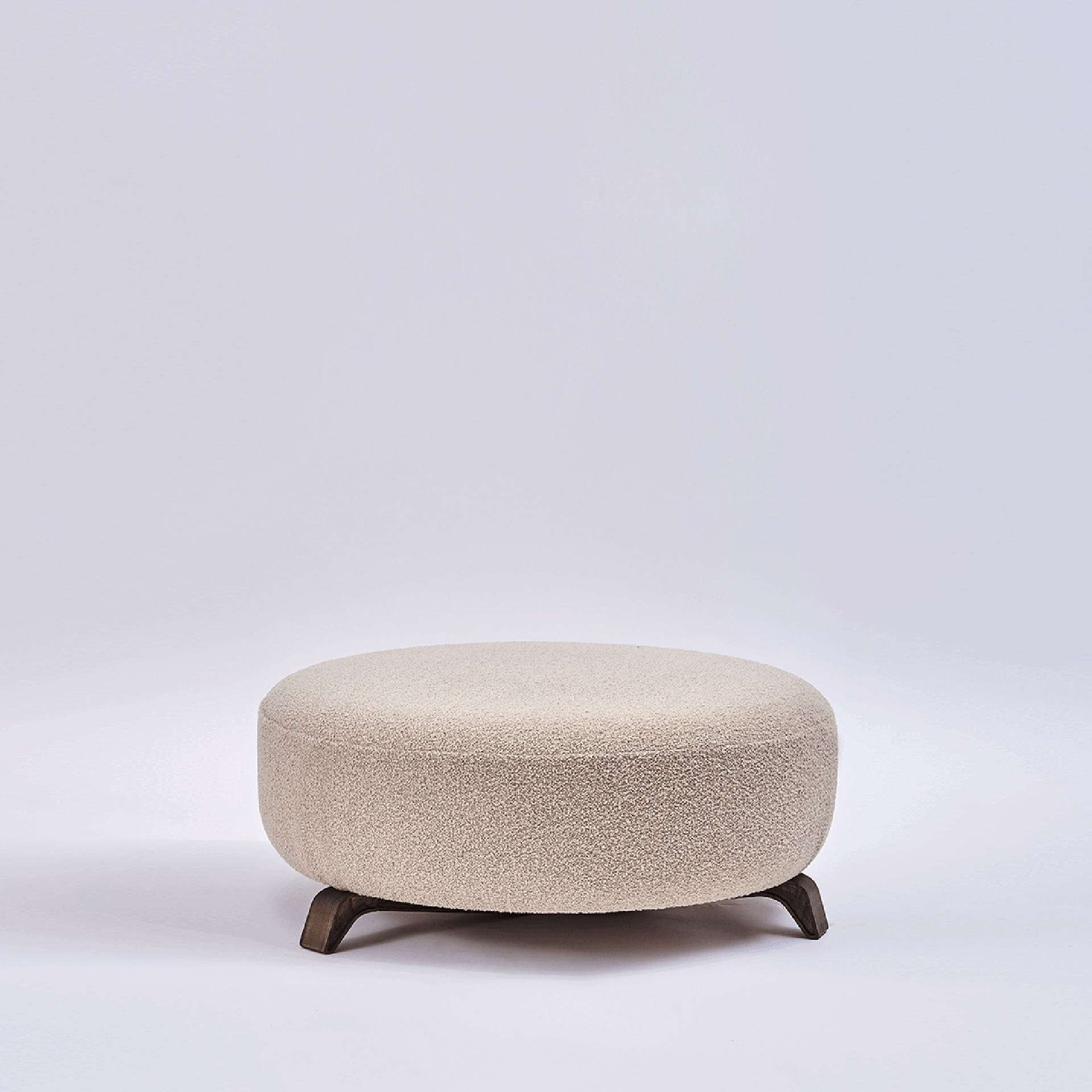 Pouf with well-rounded lines, with legs made of discarded eco-friendly solid ash with acetic finish, whose imperfections give it a striking aesthetic appearance.