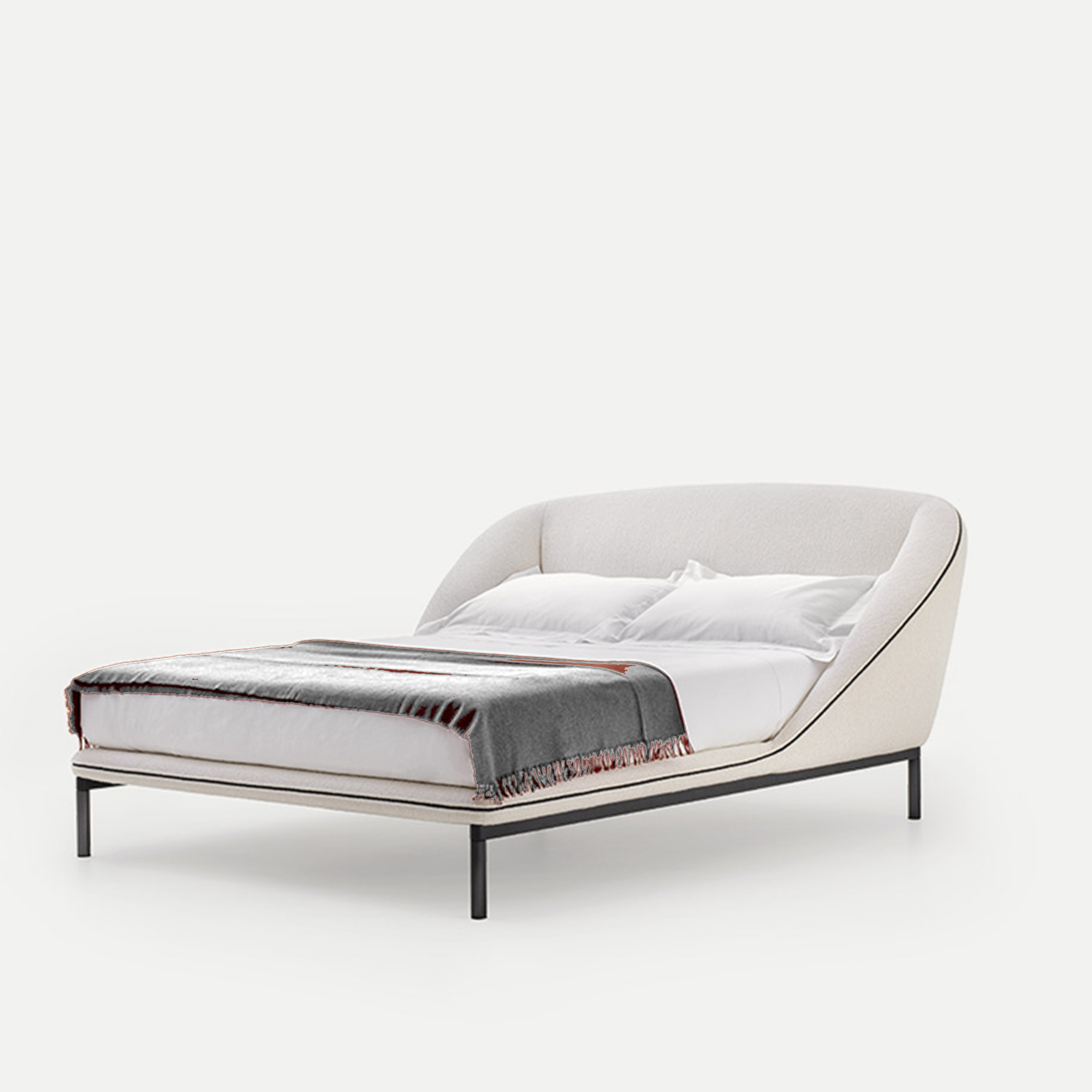 An organic design, delicate shapes that offer a warm and reassuring embrace. The bed’s profile is born from one single flowing line that includes the generous headboard, which is welcoming and enveloping. The visible zip, which runs along all the edges, is both a functional element and distinctive detail. The metal base adds lightness to the entire structure, giving the illusion that the bed is floating in space in the version with feet. The tall bed frame version includes the option of including the storage box, combining comfort and elegance.