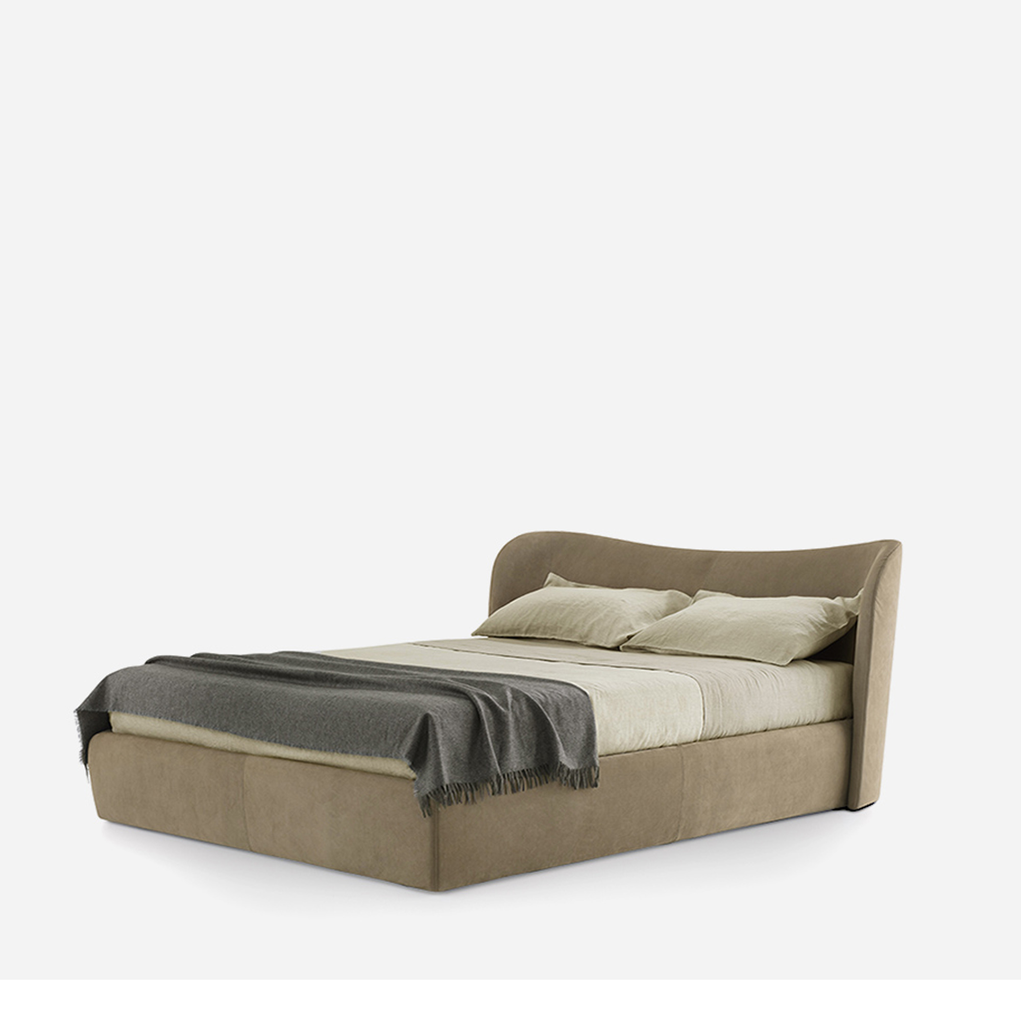Its classic-inspired forms are reassuringly solemn, distinguished, yet also inviting. The refined simplicity of the Embrace bed echoes the warmth of an embrace, a retreat to a safe haven. The dominating feature of the bed, the curved headboard, cocoons the main body of the bed in an inviting, material embrace, offering protective, reassuring shoulders. The version without an underbed storage container can accommodate a recessed mattress. Concealed legs raise the structure a few centimetres off the floor in a delicate, almost indiscernible appearance of floating.