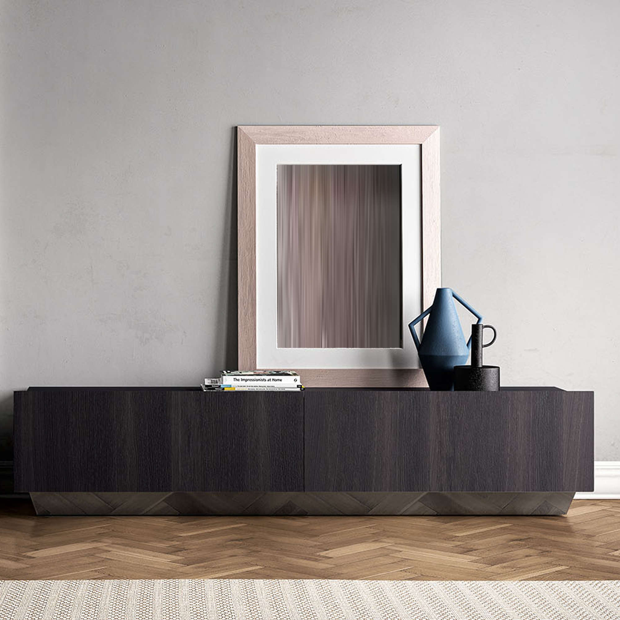 The Tosca sideboard stands out for its compact forms, finishes in a range of colours, exotic wood options and internal bar kit. The shape of the base has an elegant tapered look to it in lacquered or metallic finishes. Coordinating or contrasting, the surface finishes are available both in Wood and in Matt or Gloss Lacquered colours. The doors protrude beyond the carcass, creating an unexpected edge detail and providing an easy grip for opening, revealing a further contrast in materials between the exterior and interior finishes