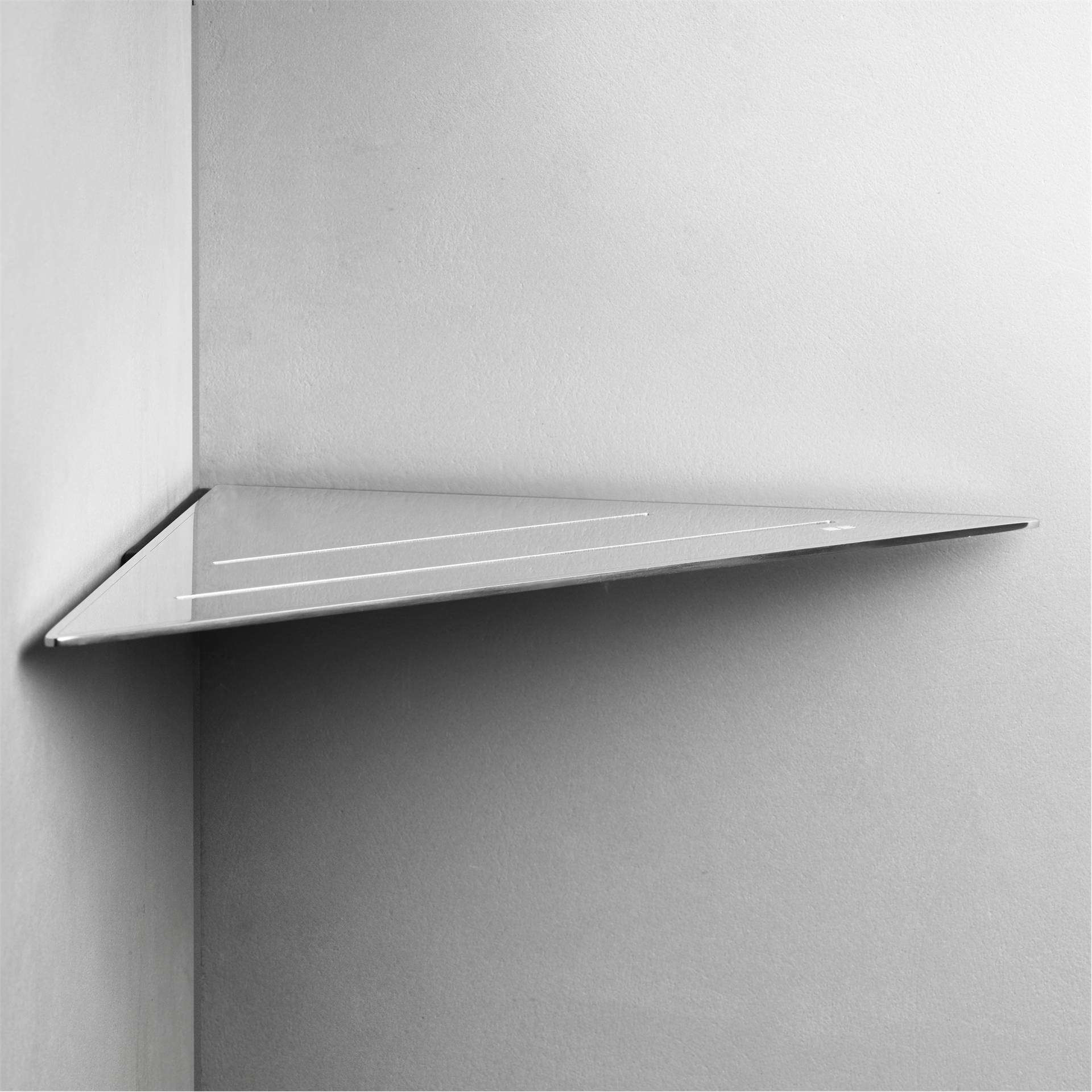 UNIDRAIN Reframe Soap Shelf Corner - Soap shelf in a reinforced steel plate to secure stability. Discreet grooves drain water away and an anti-slip barrier keeps shower essentials from sliding when the shelf is wet. The innovative wall mount can be adapted to corners, which are not excately 90°.