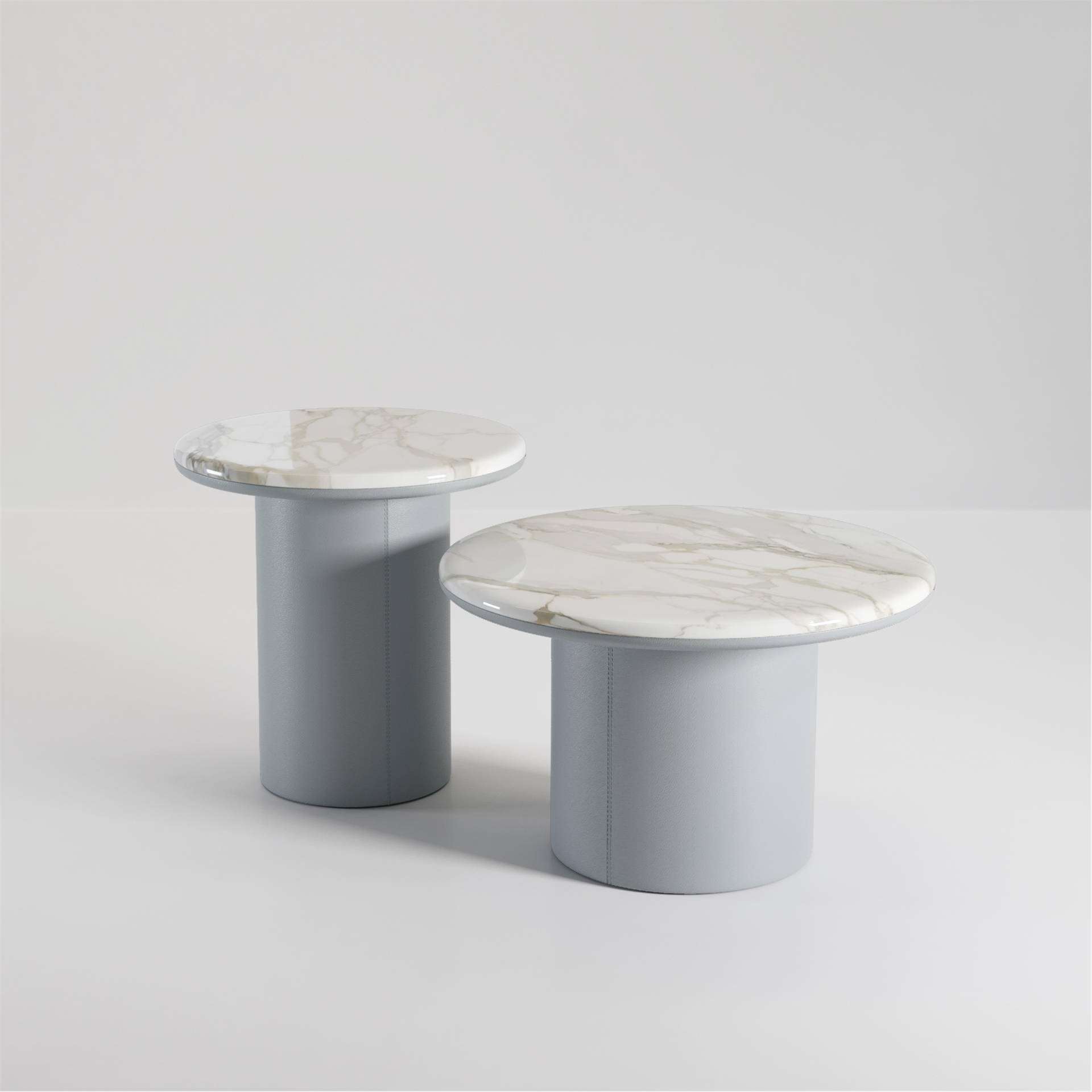 The Gemini Coffee Tables are characterised by the combination of materials on the top and bottom of the table. Leather wraps around the entire base and even continues up the underside of the table top. Half way around the top the leather stops and the table is finished by a marble top with a perfectly curved edge which mirrors the curve of the leather.