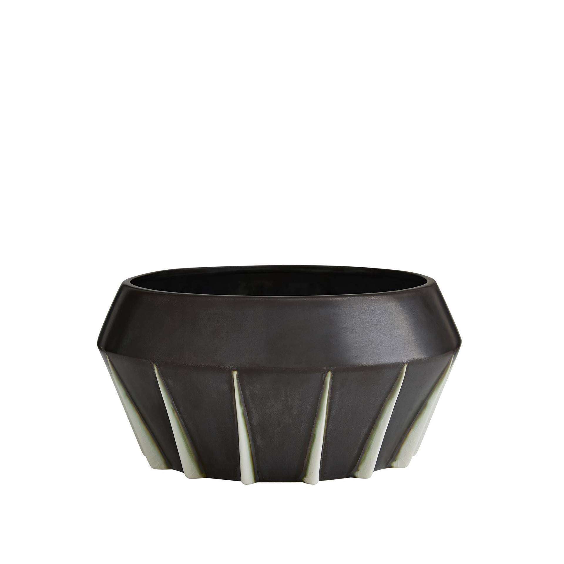 This incredibly unique centerpiece comes from inspirations in industrial design, likely to have origins in the brilliant models of machinery in the early 20th century. Though the gunmetal glaze gives it this signature industrial look, the contrasting fins and dual-tapered shape add to its style. The fins feature a ivory crackled glaze, which has a slight mint tone due to the natural reaction in collaboration with the gunmetal finish. finish will vary