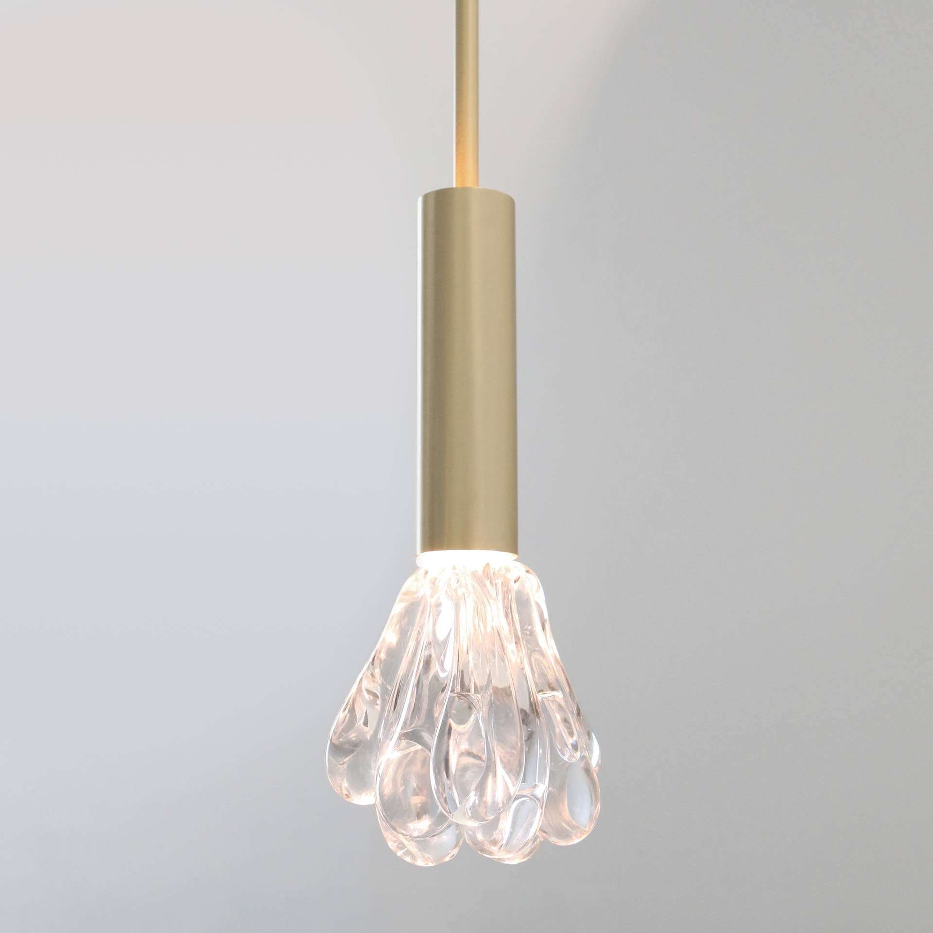 The Dew Pendant features a solid sculpted glass shape composed of layers of glass applied while hot, giving it a dripping appearance. The glass is permanently affixed to the solid brass armature, hidden behind a minimal brass cylinder, which lifts to give access to the bulb. The fixture uplights slightly through the open top of the cylinder.