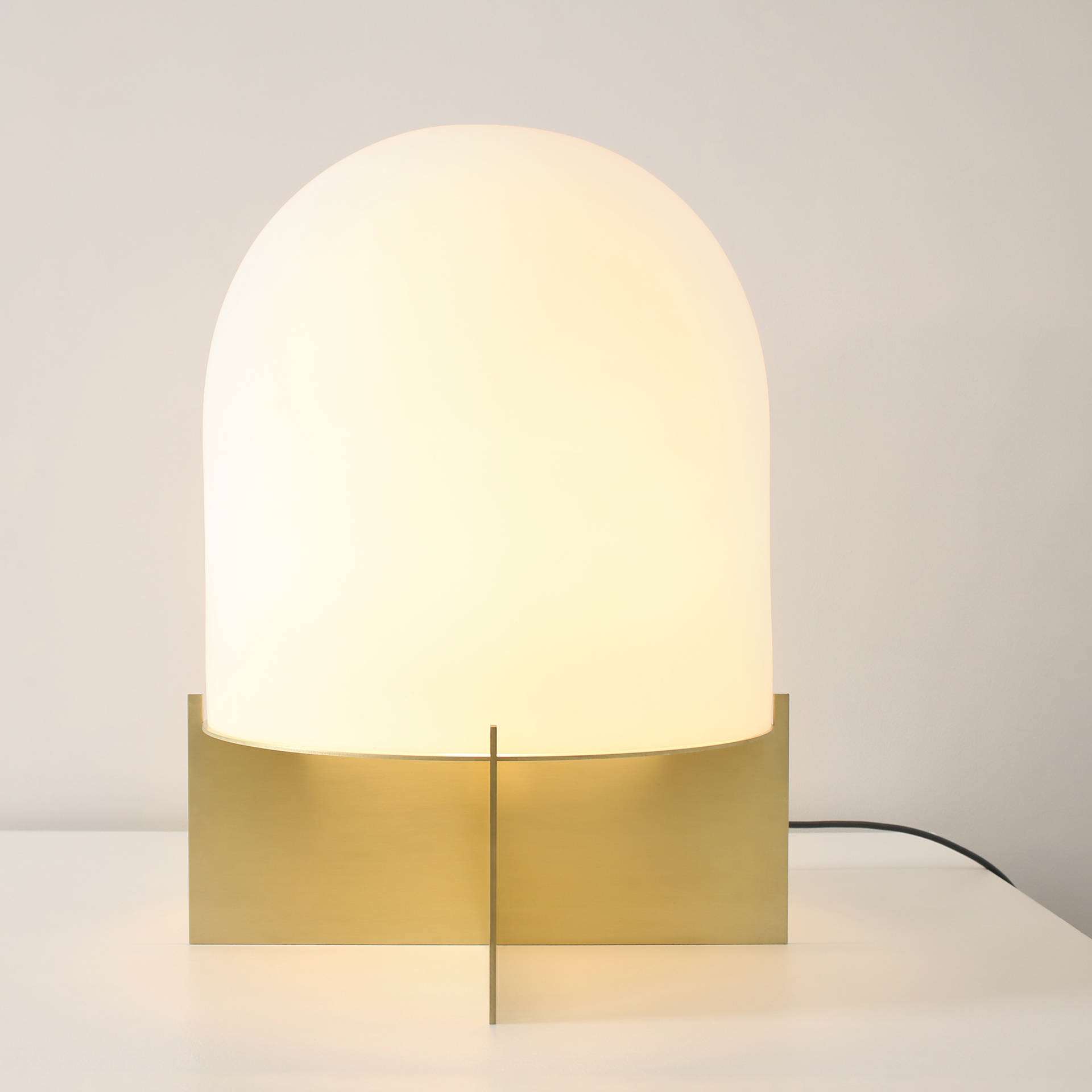 A large dome of handblown Czech glass with a frosted finish rests atop a custom base made of vertical solid brass plates. A brass ring fits onto the base as a seat for the glass dome. Imposing in size, it can work on large furniture, or the floor, depending on the decor. While large, the softness of the frosted glass and minimal presence of the base make it approachable and compelling.