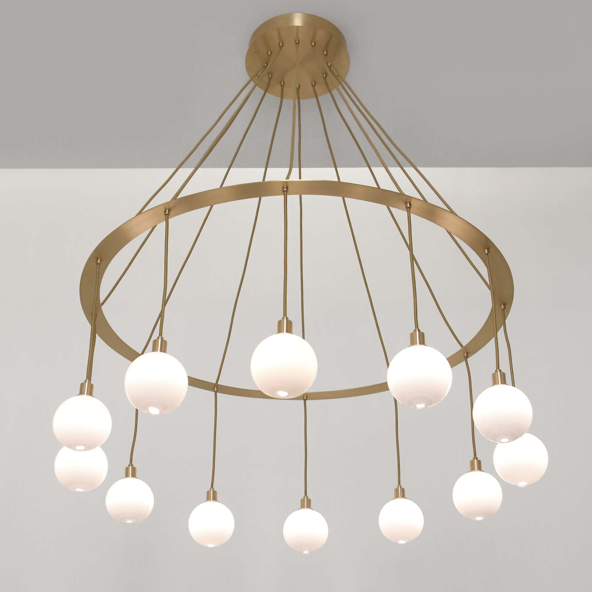 The Drape Circle 12 Chandelier consists of 12 individual pendants gathered and supported by a brass ring. Each pendant features a diffuser of handblown Czech glass suspended on a fabric-wrapped electrical cord. The cords pass through the ring and are evenly spaced around the circumference. The glass diffusers are available in three shapes and in both "dipped" glass, featuring the SkLO double-dipped flame-polished mouth and "textured" glass, featuring a soft, frosted finish and subtle sculpted vertical ridges. Cord lengths are field adjustable.
