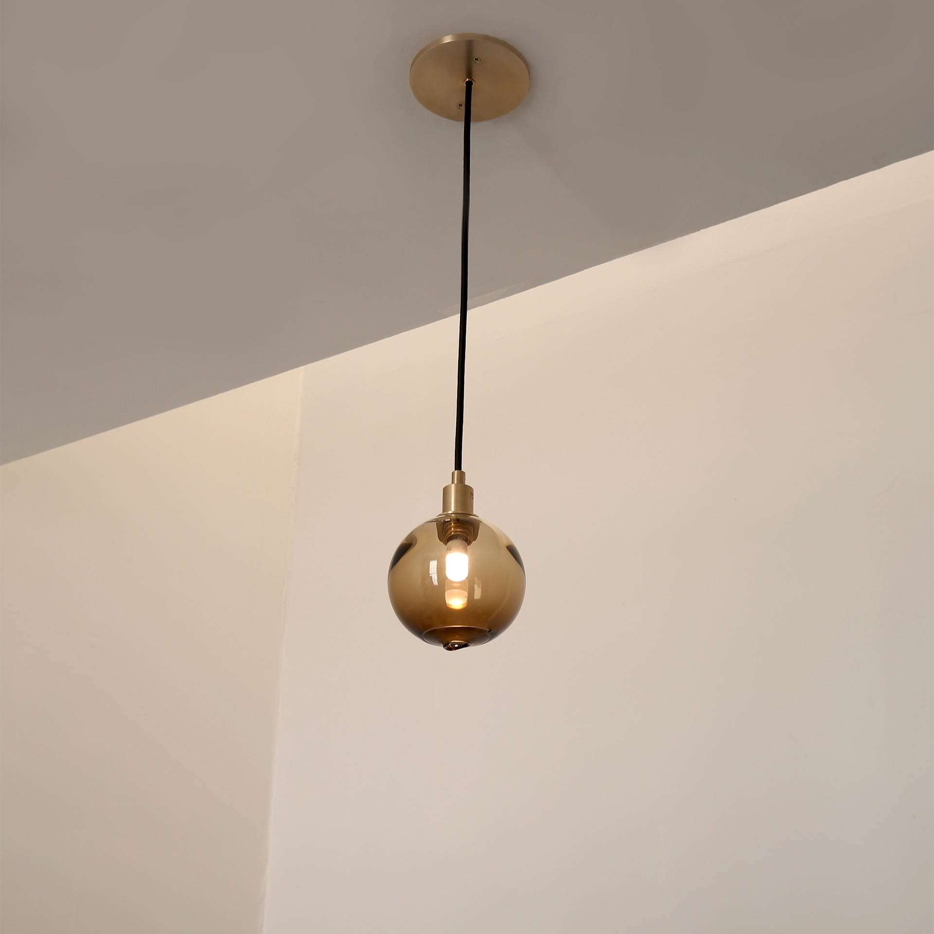 This minimalist pendant features a single lit sphere of handblown Czech glass suspended on a fabric-wrapped electrical cord.