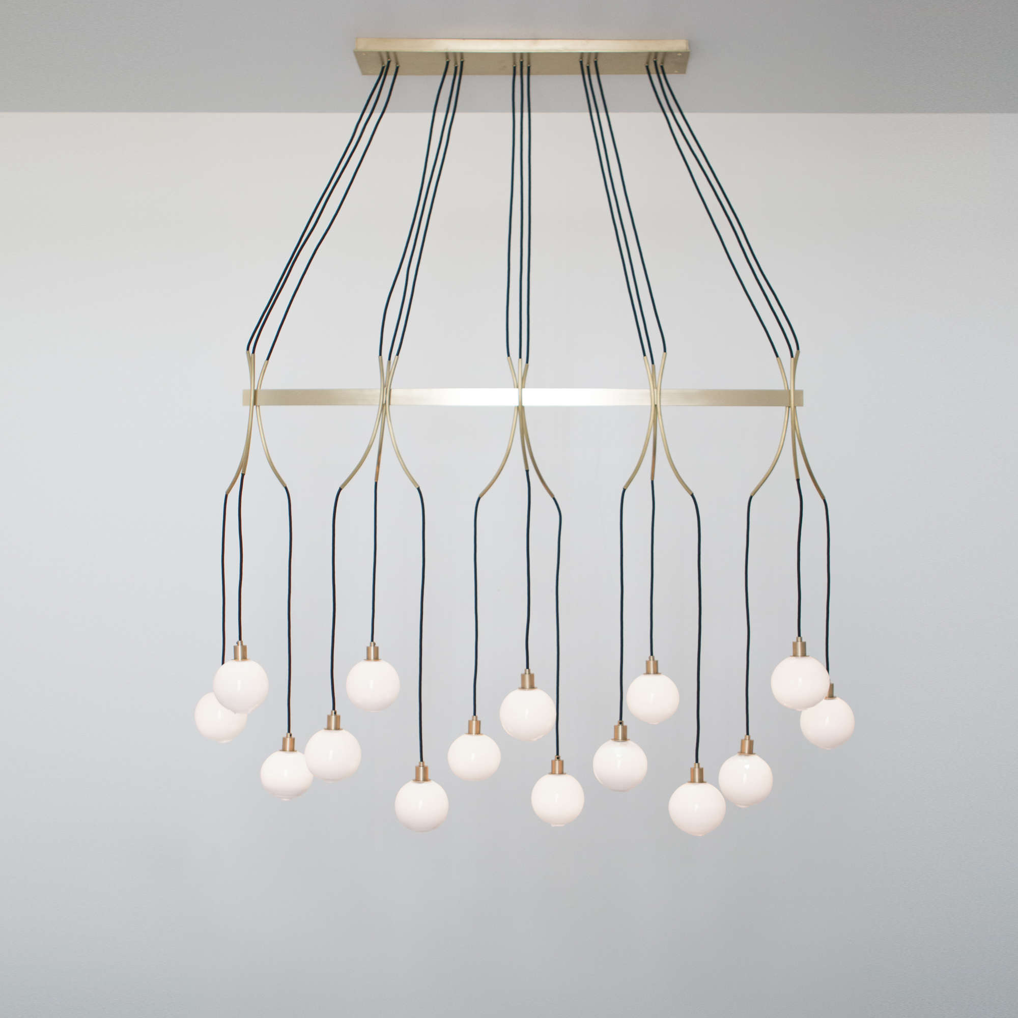 The Drape Skirt 15 Chandelier consists of 15 individual pendants gathered into 5 groups of 3 and supported by a series of 5 brass “skirt” structures along the length of a brass bar. The “skirts” attach to the bar by a series of simple slotted connections, allowing the “skirts” to hold the bar with the slight friction of the cords passing through the smooth brass tubes of the “skirts”. Each pendant features a 4.5”/110mm diameter diffuser of handblown Czech glass suspended on a fabric-wrapped electrical cord. The cords pass through and are affixed to the bar, and are evenly spaced around its length. The glass diffusers are available in both "dipped" glass, featuring the SkLO double-dipped flame-polished mouth and "textured" glass, featuring a soft, frosted finish and subtle sculpted vertical ridges. Cord lengths are field adjustable.