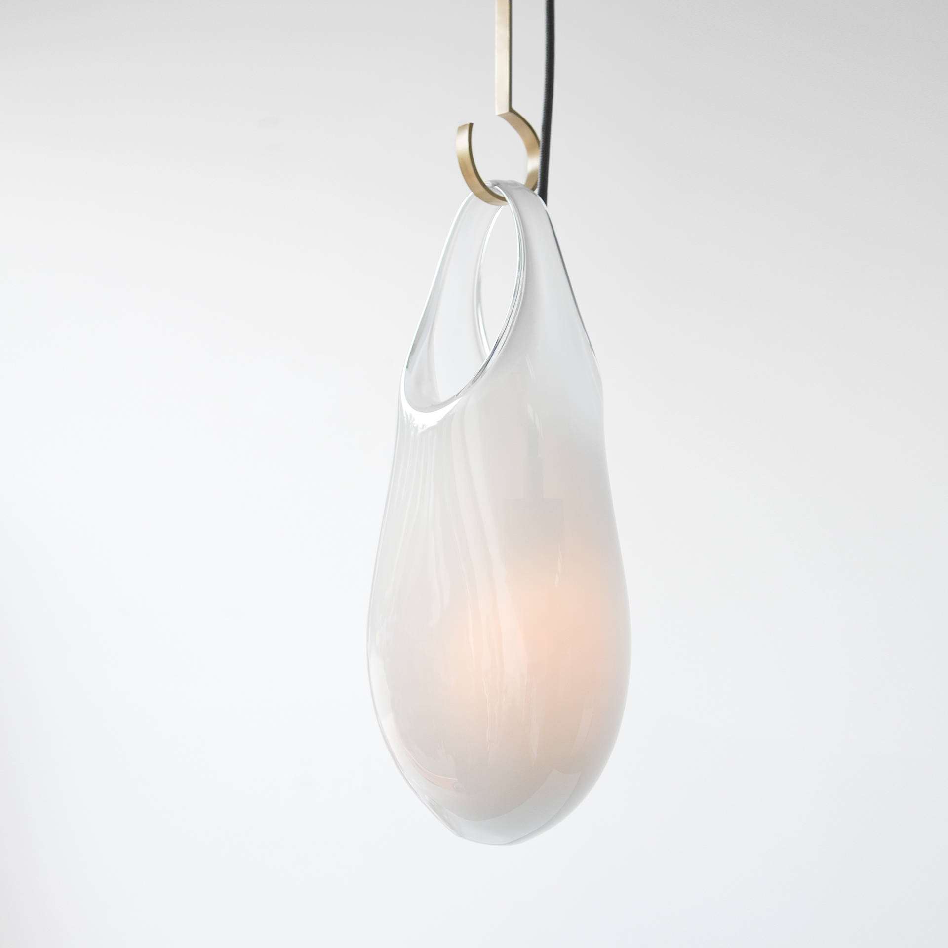 An expressive glass vessel that appears to droop from its hook as if molten serves as a shade on this pendant. Available in two sizes. The glass shade hangs from a double-ended brass hook, custom fabricated to?the specified length. The hook hangs from a loop at the canopy.