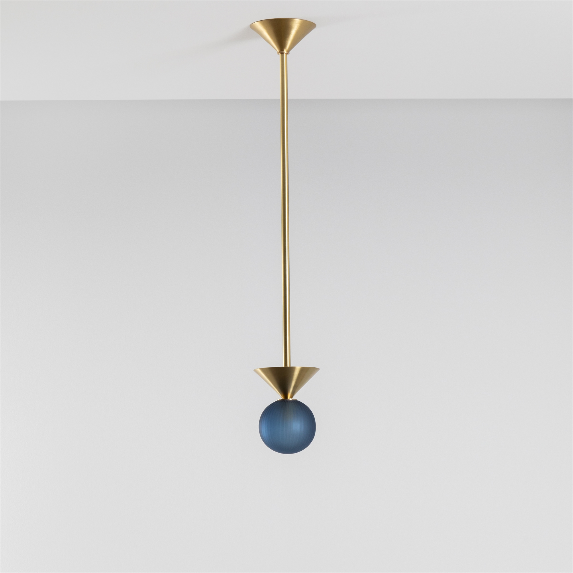 The Peak Pendant is a lit shape of handblown glass supported beneath a small conical form. The cone can be installed in either the pointing-up or pointing-down position. The ceiling canopy is an identical conical shape, mirroring the form of the pendant itself. The glass diffusers are available in two shapes and both "dipped" glass, featuring the SkLO double-dipped flame-polished mouth, and "textured" glass, featuring a soft, frosted finish and subtle sculpted vertical ridges.