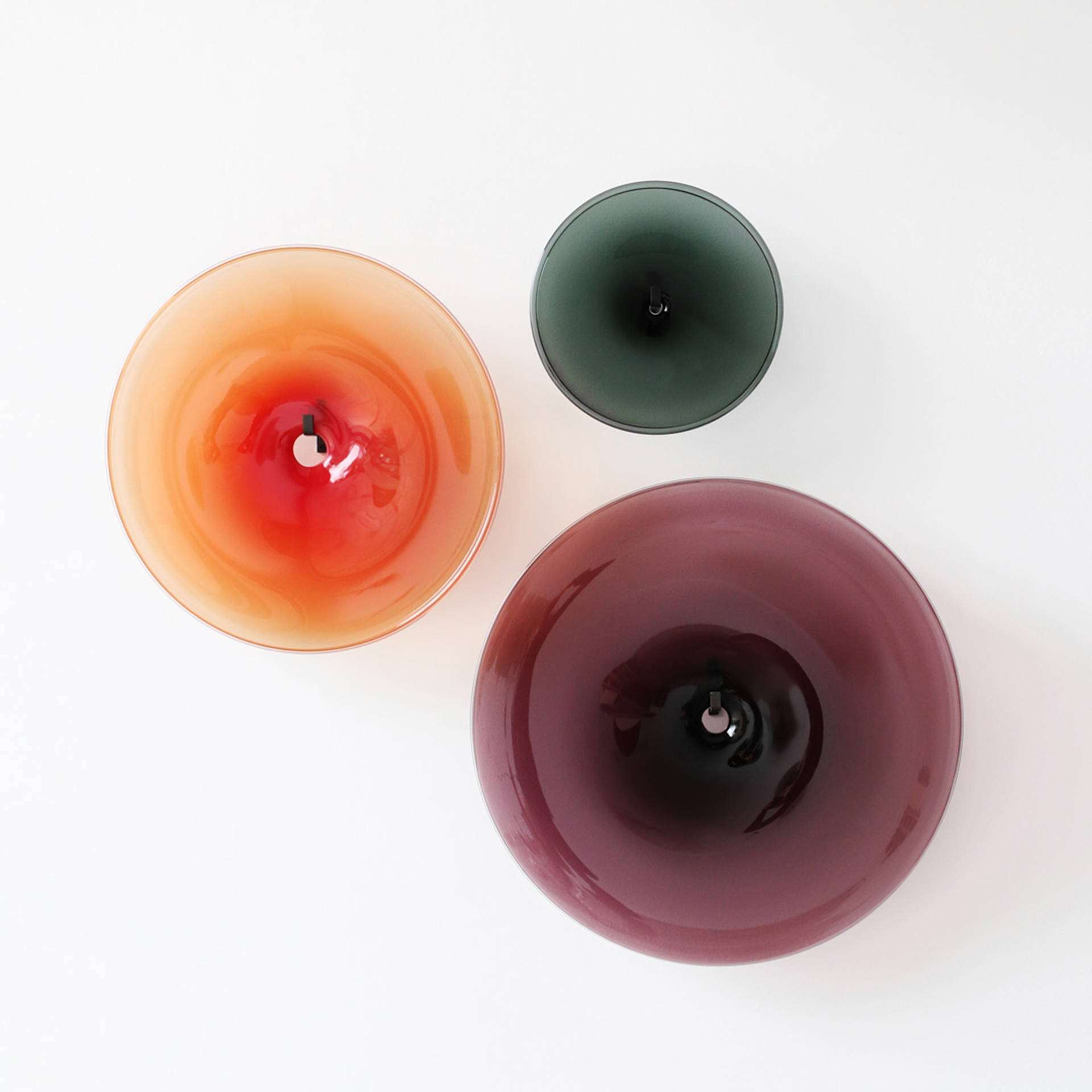 SKLO Pool Wallpiece Discs of handblown glass with open mouths at the center where the pieces are broken from the glass master’s pipe and flame polished, giving each a unique detail. SkLO Pool Wallpieces are hung with handmade steel wall hooks. The steel wall hooks come in two different depths, 3" and 4" (75 and 100mm) to allow for slight overlapping of the discs. Unless otherwise specified, a mix of 3" and 4" hooks is provided.