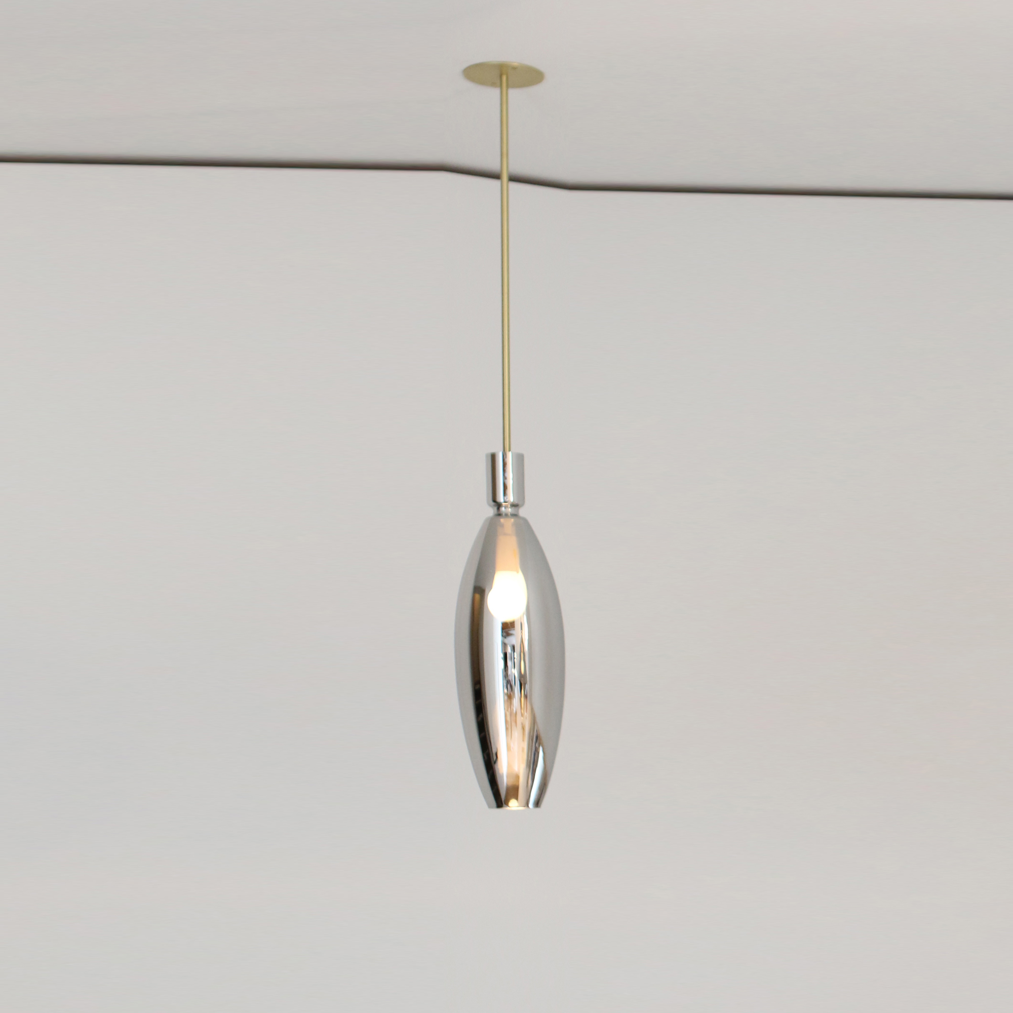 Reflect Pendants are a series of mirror-plated glass pendants in different geometric shapes suspended on rigid brass stems. The glass is mirrored using a unique process that produces an opaque mirror appearance when the light is off but allows light to pass through when on. Each shape has an open mouth at the bottom, the hole ground, and polished. The glass sits on a rest at the end of the stem and lifts to expose the socket for changing the bulb. Available in three different shapes. Glass available in silver mirror finish only.