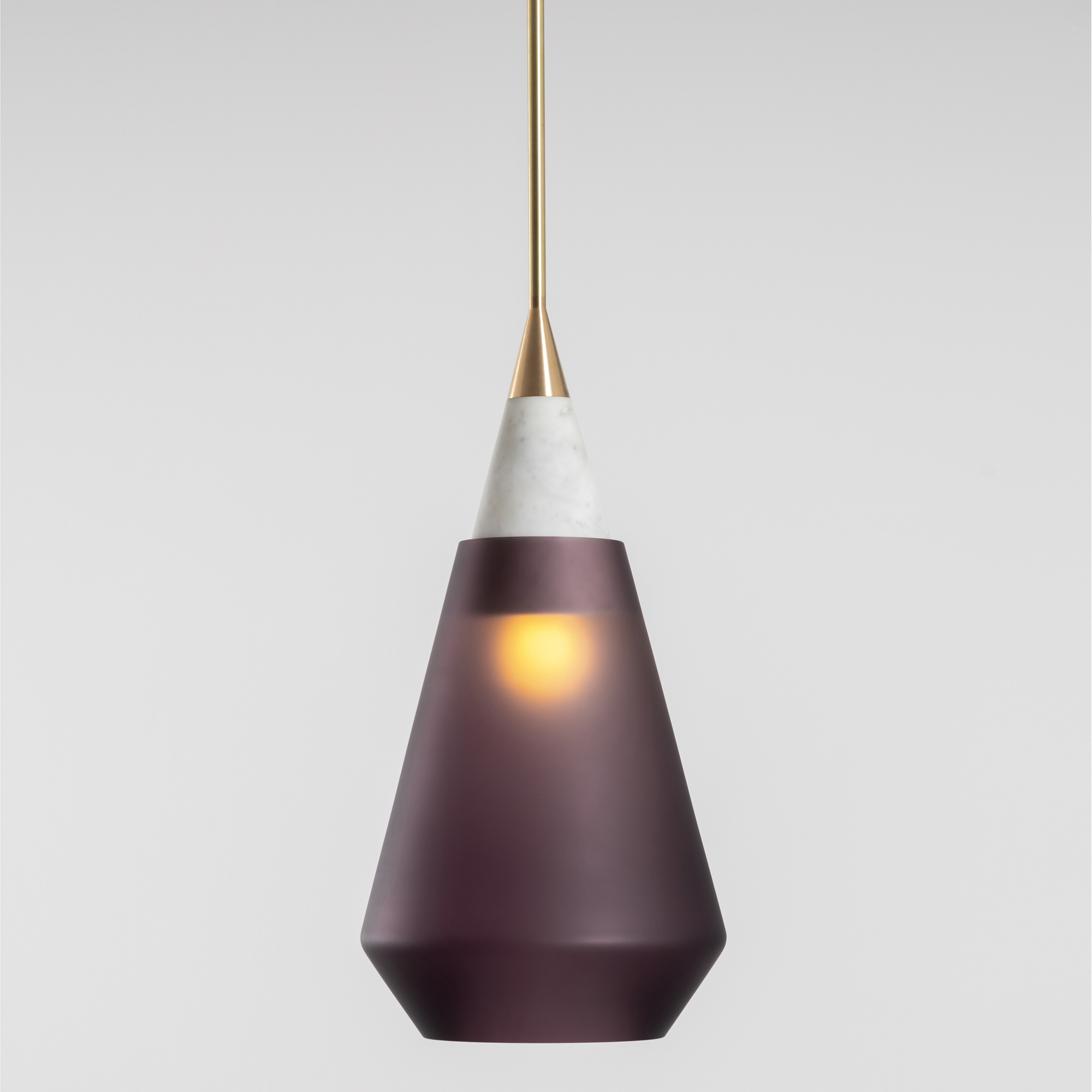 Rest Pendants are conical shapes of honed carrara marble that support frosted handblown glass shades. Each is topped with a custom brass finial and suspended on a rigid brass stem. The glass shades have an angular geometry that bevels inward at the bottom. The three unique shapes have different proportions and angles, yet all share the same language, making them natural partners when used in groups within the same space. These are timeless and elegant fixtures. The pairing of metal, marble and handblown glass gives them a classic presence.