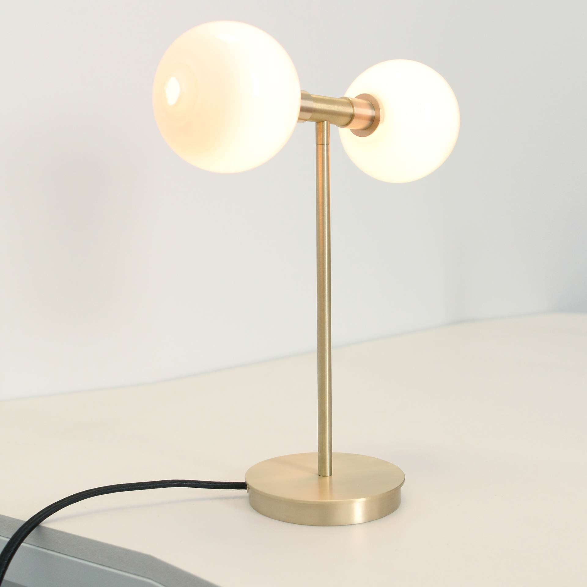 The Stem 2X Table Light is a minimal design consisting of a pair of lit spheres of handblown Czech glass on a symmetrical armature atop a brass stem and base.