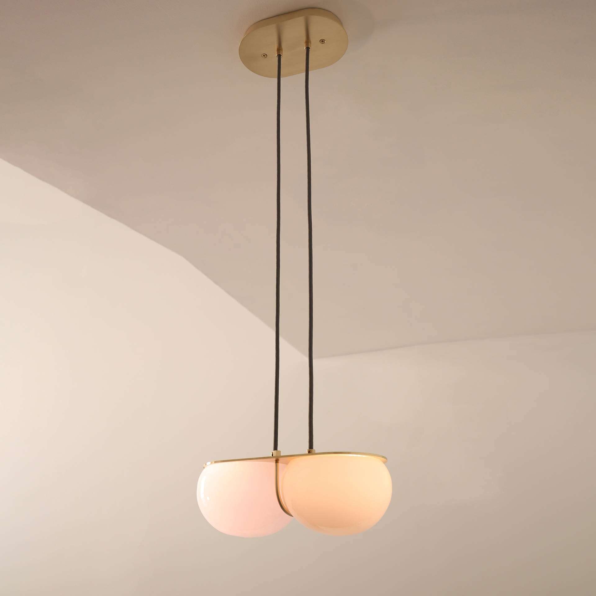 A two-tone diffuser of handblown Czech glass made up of two flattened spherical shapes in two colors which are melded together while hot on the glass blower’s pipe. The glass is held to a solid brass canopy by a brass band that sits at the "waist" between the two spheres. Each sphere is lit from within by its own bulb, one in each sphere. Suspended on two fabric-wrapped electrical cords from a canopy whose shape mimics the geometry of the pendant itself.