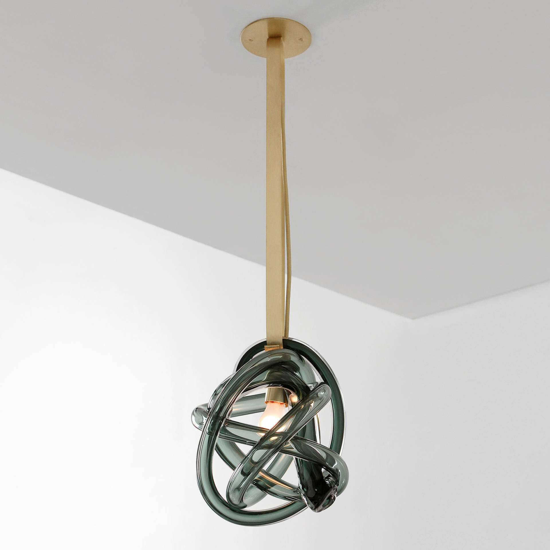 An expressive glass vessel that appears to stretch under its weight serves as a shade in this pendant. The glass element here is different from that of the Hold Sconce and Hold Pendant in that is round and not flattened, and it is also of a different size. The glass element hangs from a brass "pin" element, made of a continuous ribbon of the brass bar, which opens and closes to allow for removal of the glass.