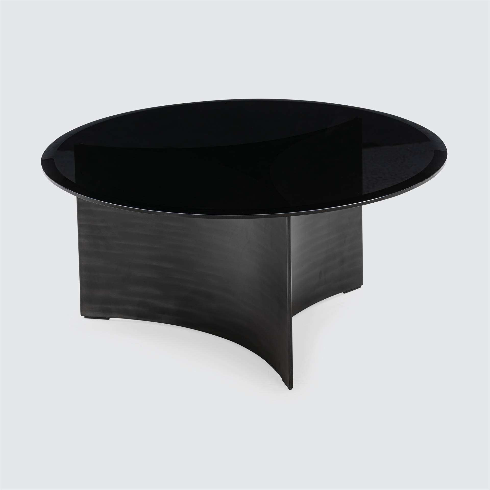 Juxtaposing the solid base and the lightness of the slightly translucent tabletop, Arc prompts a contemporary take on the well-known typology. The dark glass simultaneously reflects the surroundings while revealing the sculptural silhouette of the base.