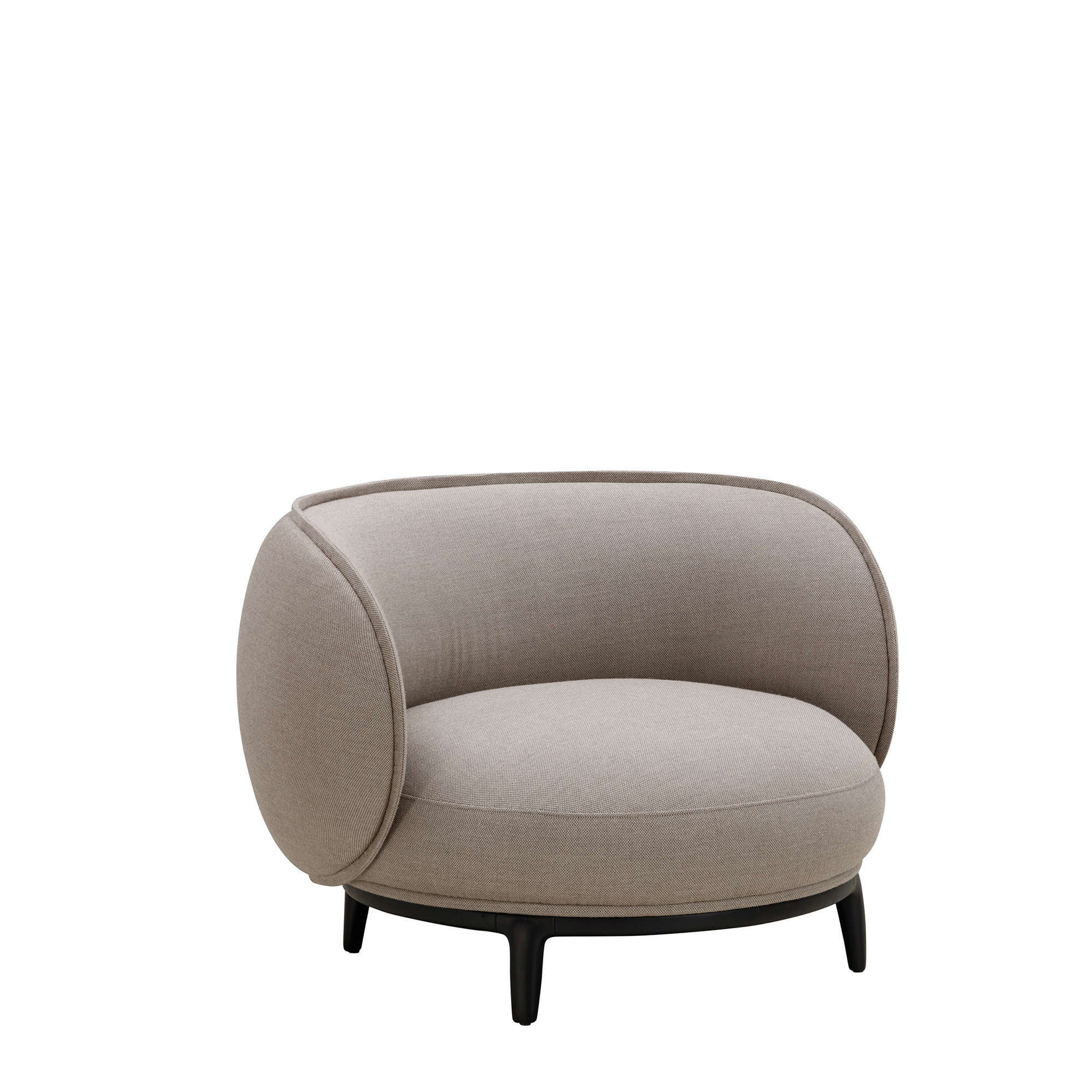 With pronounced piping details defining the shape, the lounge chair’s sweeping backrest is seamlessly attached to the round, voluminous seat. Elevated by a frame and gently tapered legs in powder-coated cast aluminium, the chair radiates confidence while maintaining a grounded presence.